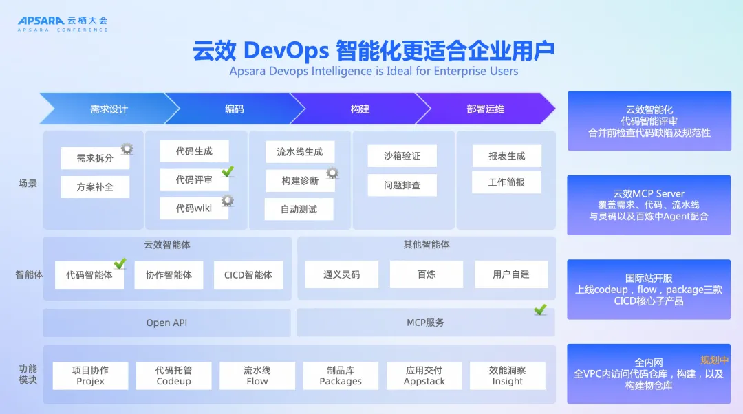 阿里云云效 AI DevOps 打通了从编码、构建到运维的全链路,并集成灵码、AIOps 等,将 AI 能力注入其中。当代码提交发布后,系统会自动捕获并关联线上问题,由 AI Agent 生成智能诊断报告。