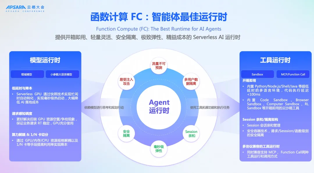 工具运行时方面,函数计算内置 Python/Node.js/Shell/Java 等多语言执行引擎,代码执行延迟 < 100ms;内置 Code Sandbox 、Browser Sandbox 、Computer Sandbox 、RL Sandbox 等开箱即用的云沙箱工具。在安全隔离方面,函数计算通过安全容器技术,提供请求级别、会话级别以及函数级别多维度隔离机制,为每一个任务提供了虚拟机级别的强隔离。同时结合会话级别的动态挂载能力,实现计算层与存储层的安全隔离,全场景覆盖 Sandbox 最严苛的代码执行安全与数据安全的诉求。而在模型运行时方面,函数计算则专注于领域模型与小参数大语言模型的托管。