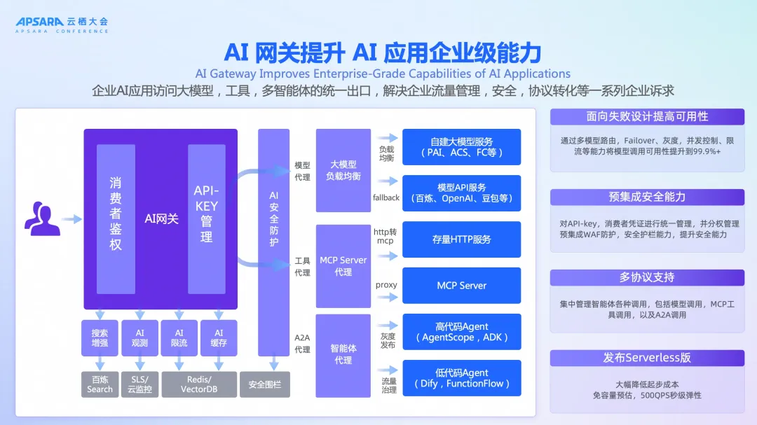 - 提供企业级能力,包括内置可观测、安全能力、消费者鉴权和灰度发布。
