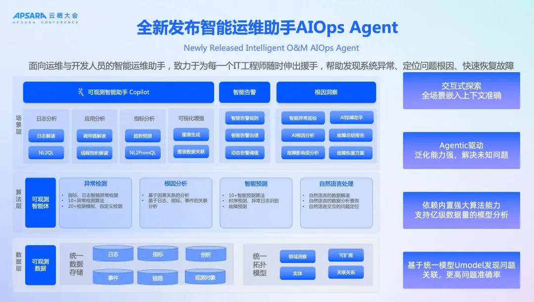 除了完整的解决方案,我们也提供了面向运维与开发人员的智能运维助手,帮助每一个 IT 工程师提升系统异常发现、问题根因定位、故障恢复的效率。