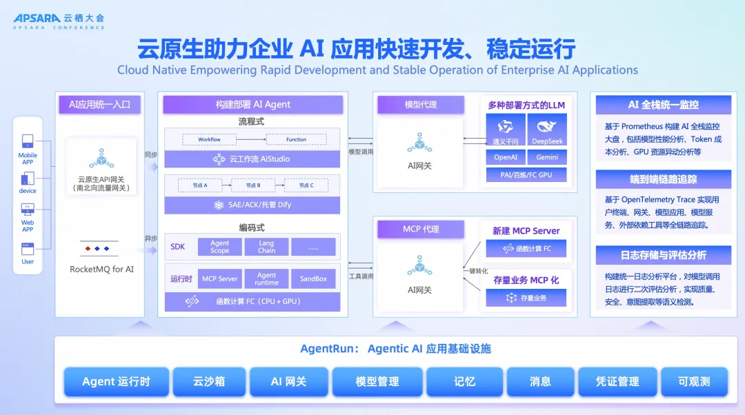 这些问题的解决,需要云基础设施从传统形态升级为 AI 原生架构。AI 基础设施的核心要素包括:具备毫秒级弹性的函数计算运行时、统一流量治理与协议适配的 AI 网关、支撑异步高吞吐通信的消息中间件,以及覆盖模型调用、智能体编排和系统交互的全栈可观测体系。只有在这一新型基础设施的支撑下,智能体应用才能真正成为企业应用架构的“新基建”,推动业务持续智能化升级。