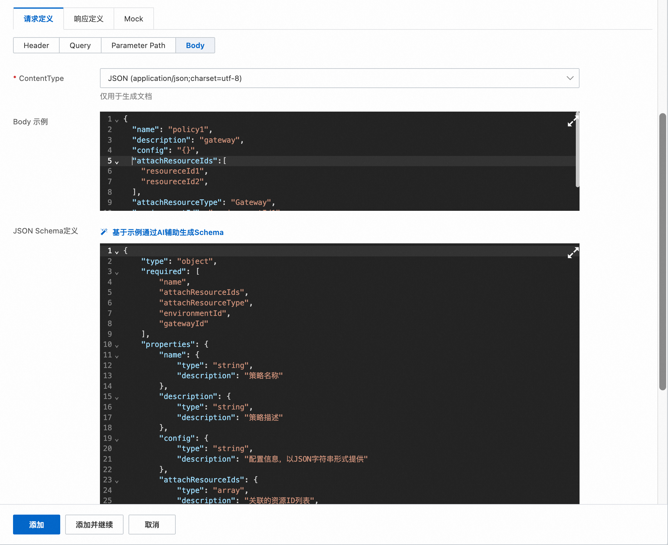 在 API First 原则中,文档也是不可或缺的一部分,每次修改接口对应的接口文档也需要同步更新,既然我们在 API 管理平台上完整录入了接口的元数据信息,那么相关的文档、SDK、spec都应该实时更新。下面我们看到,比如请求参数的 Body 信息,其中JSON Scheme是用于 API 接口文档的详细内容生成。如果我们不填写,后续文档的可读性会大大降低,但我们也发现这个内容其实非常重复性且标准化,所以API网关提供了 API 辅助生成Schema的能力。
