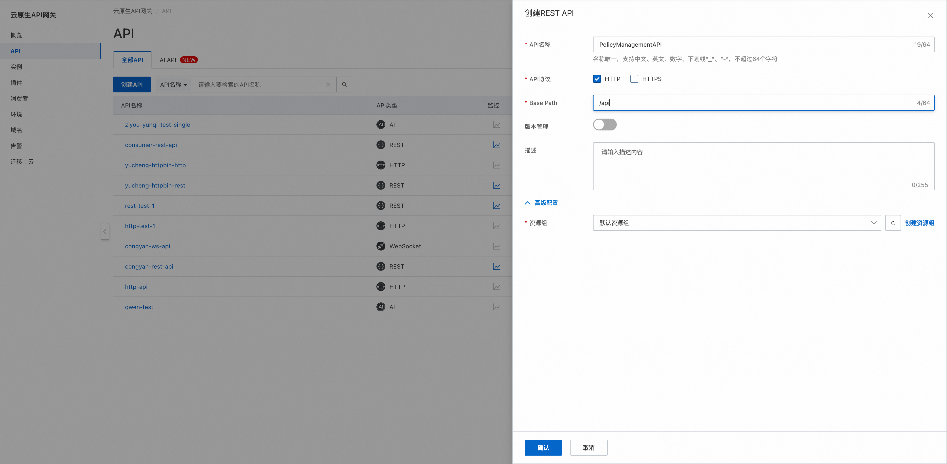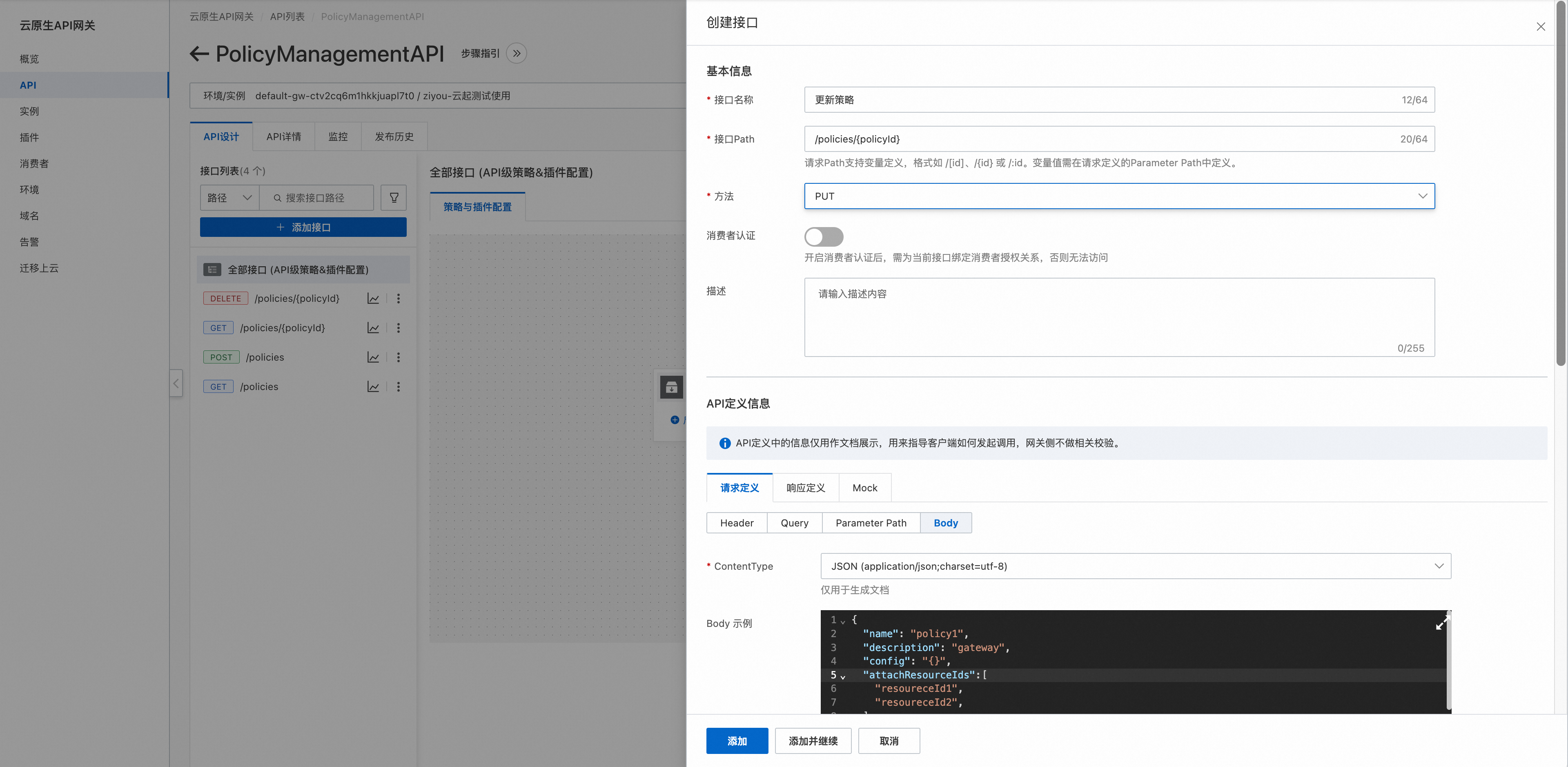 我们可以看到云原生API网关中,API是整个产品的第一公民,与 API First 的开发原则显得异曲同工。首先先创建PolicyManagementAPI。在创建的过程中我们看到,支持OAS/Sawgger等标准导入API,也支持手动创建整个流程。我们先看看手动录入的效果。