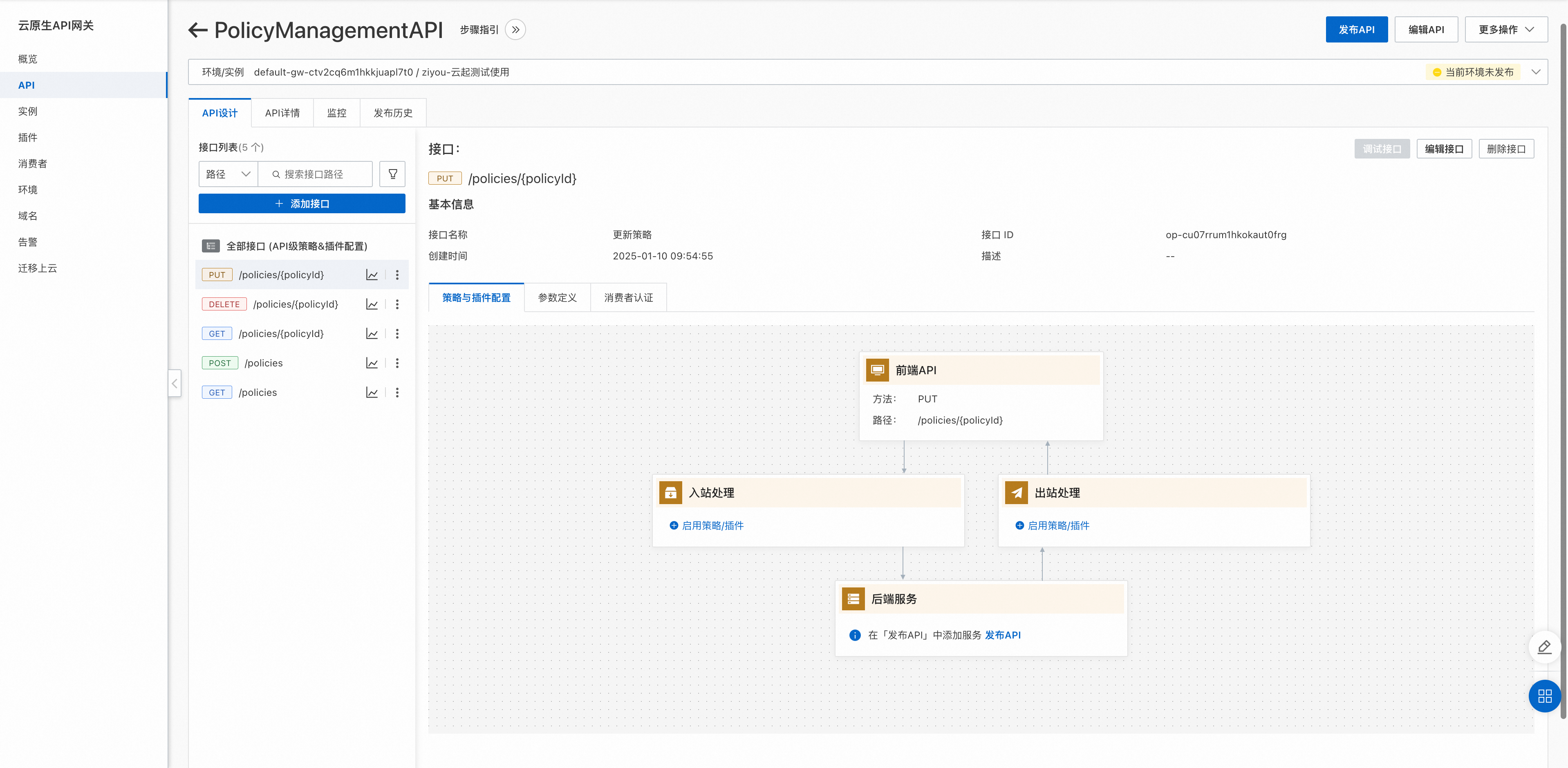 openapi: 3.0.0info: title: Policy Management API version: v1servers: - url: /apipaths: /policies/{policyId}: get: summary: Get details of a specific policy. operationId: getPolicy parameters: - name: policyId in: path required: true description: The ID of the policy to retrieve. schema: type: string responses: '200': description: Successful response with the policy details. content: application/json: schema: $ref: '#/components/schemas/Policy'components: schemas: Policy: type: object properties: id: type: string name: type: string description: type: string createdAt: type: string format: date-time updatedAt: type: string format: date-time设计好Policy相关的 API 后,我们需要一个完整的 API 生命周期管理能力来帮助我们实践 API First。我们以阿里云的云原生 API 网关为例,实践整个API First的开发模式。