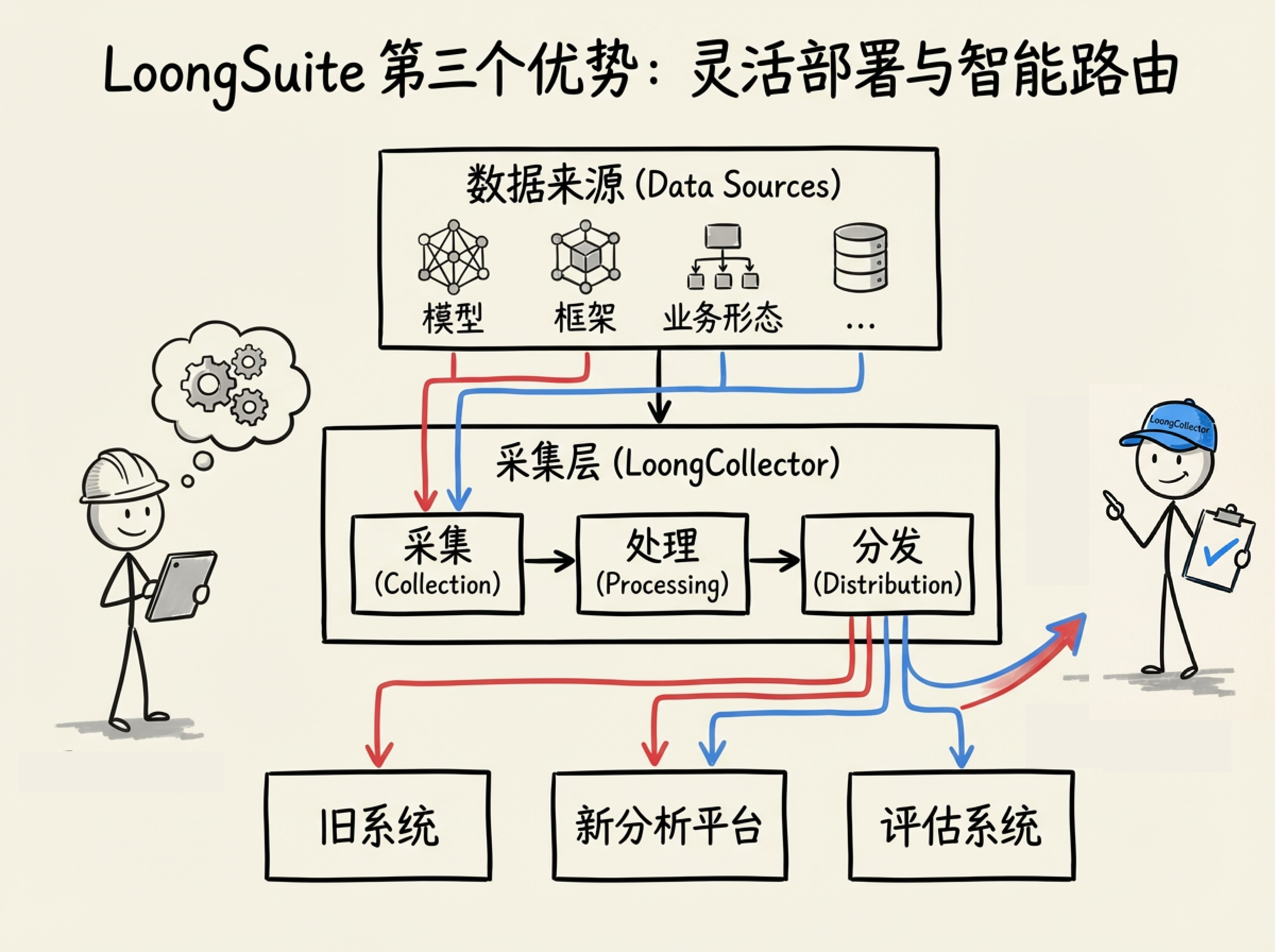 LoongCollector 通过模块化架构,将采集、处理与分发解耦,使不同来源、不同语义的数据可以在采集层完成结构化转换,并根据策略被路由至不同的下游系统。这种设计让工程团队可以在不破坏既有体系的前提下,引入新的分析平台或评估系统,从而保证可观测能力能够伴随 Agent 应用一同演进,而不是成为制约创新的瓶颈。