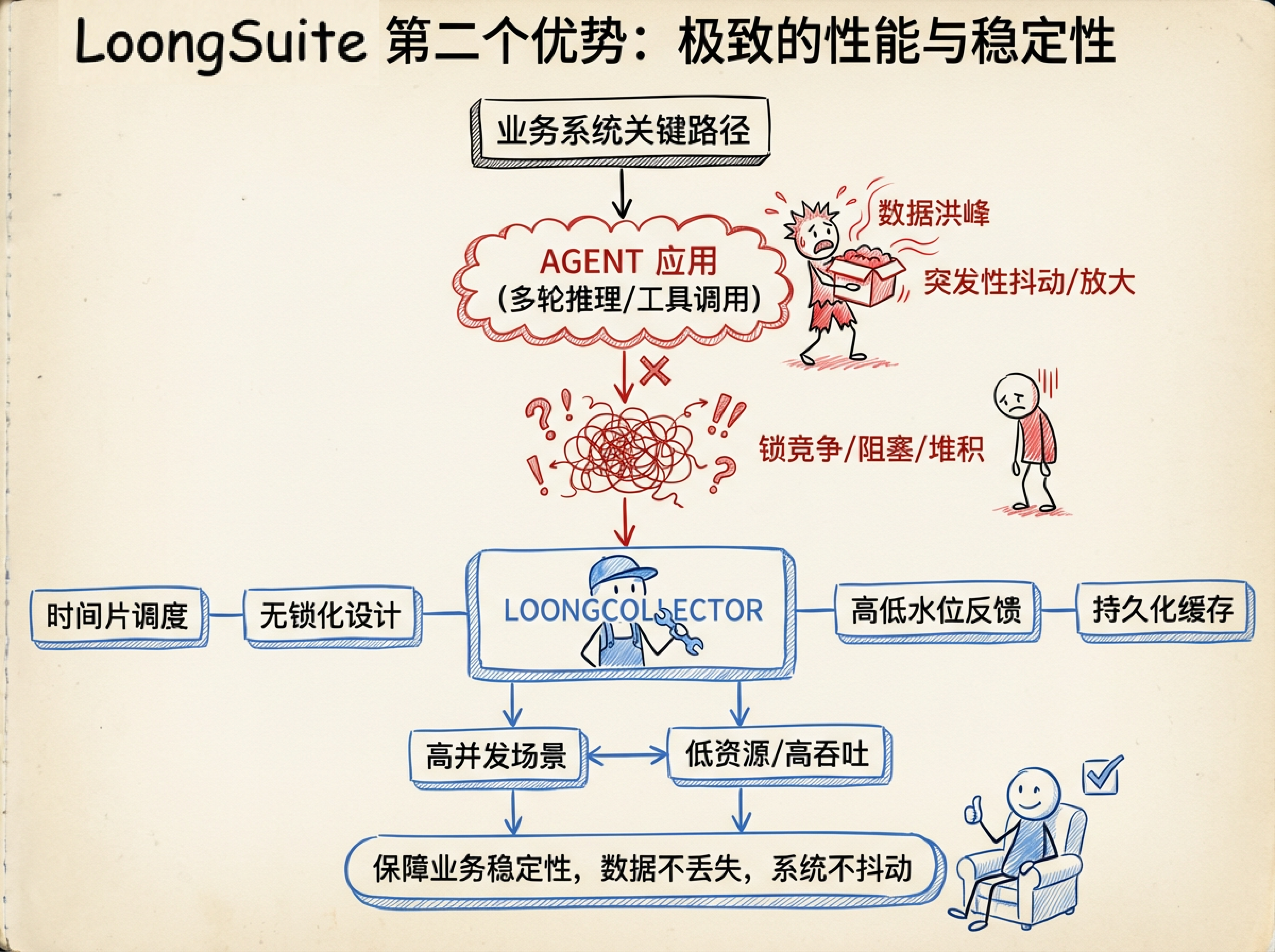采集系统位于业务系统的关键路径,一旦自身引入额外抖动,影响往往会被迅速放大。尤其是在 Agent 应用中,多轮推理和频繁的工具调用会带来突发性的数据洪峰,如果采集组件在高并发下出现锁竞争、阻塞或无序堆积,很容易将原本可控的性能波动升级为全链路问题。