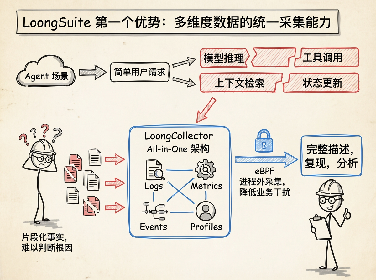LoongCollector 将 Logs、Metrics、Traces、Events、Profiles 统一纳入同一采集与关联体系,本质上是在还原 Agent 的真实执行过程,让问题不再停留在“感觉不对”,而是可以被完整描述、复现和分析。LoongCollector 采用 All-in-One 架构,支持包括 Logs、Metrics、Traces、Events、Profiles 的全类型数据采集,同时通过 eBPF 实现进程外采集,降低业务干扰。