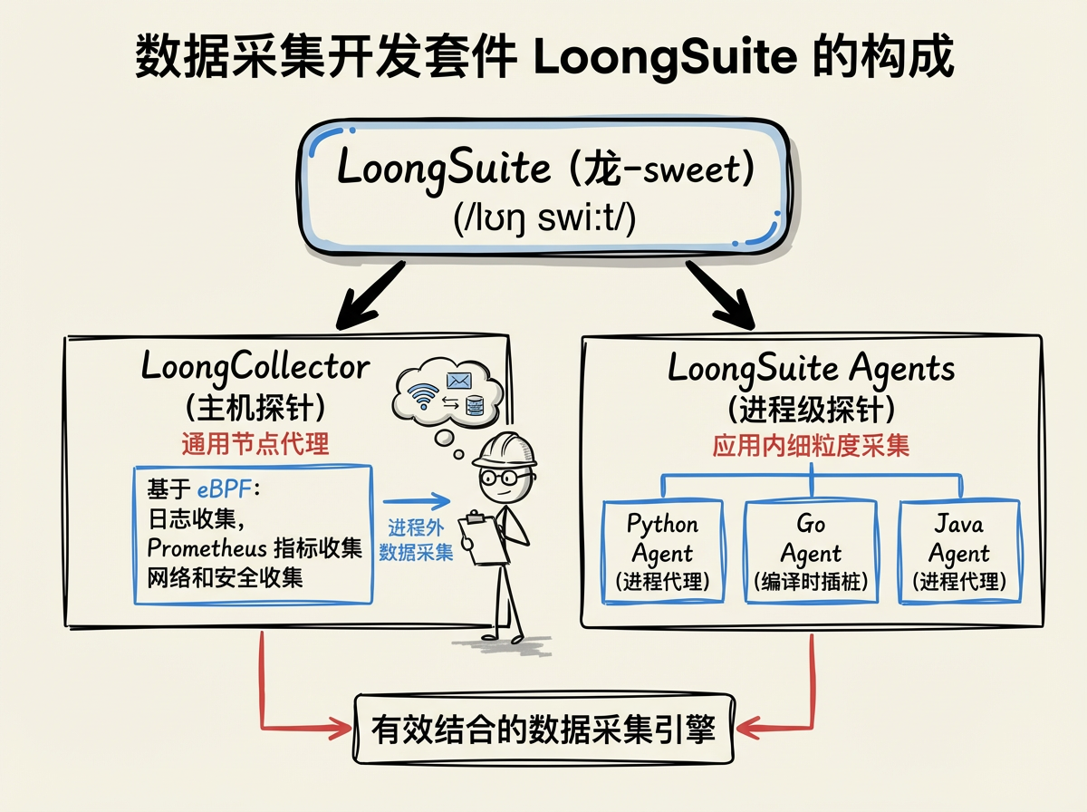 作为一款开源的数据采集开发套件, LoongSuite(/lʊŋ swiːt/,音译 龙-sweet)包含主机探针、进程级探针和数据采集引擎三部分,其中: