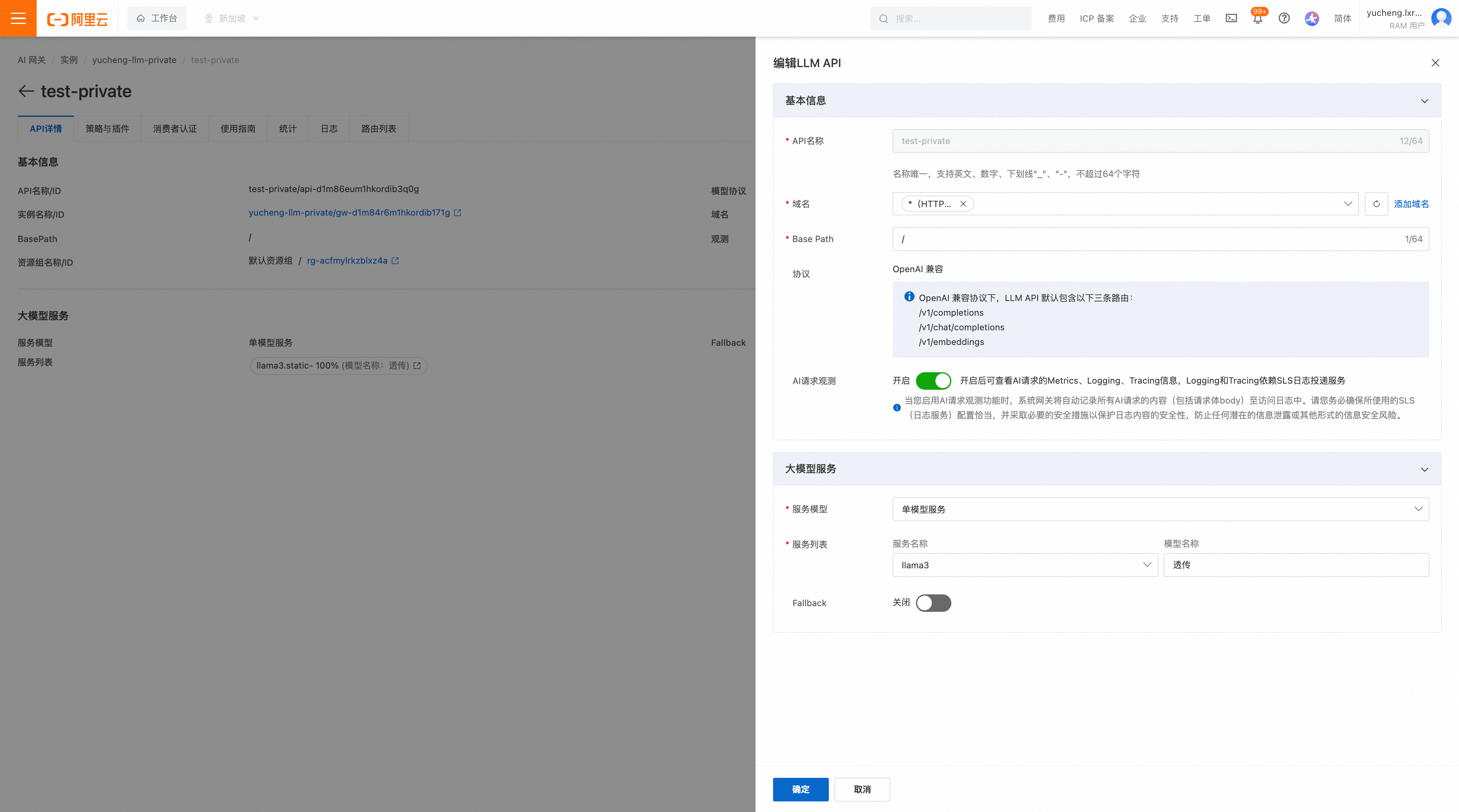 - 在网关配置API:在网关中创建一个LLM API,后端服务指向llama3.