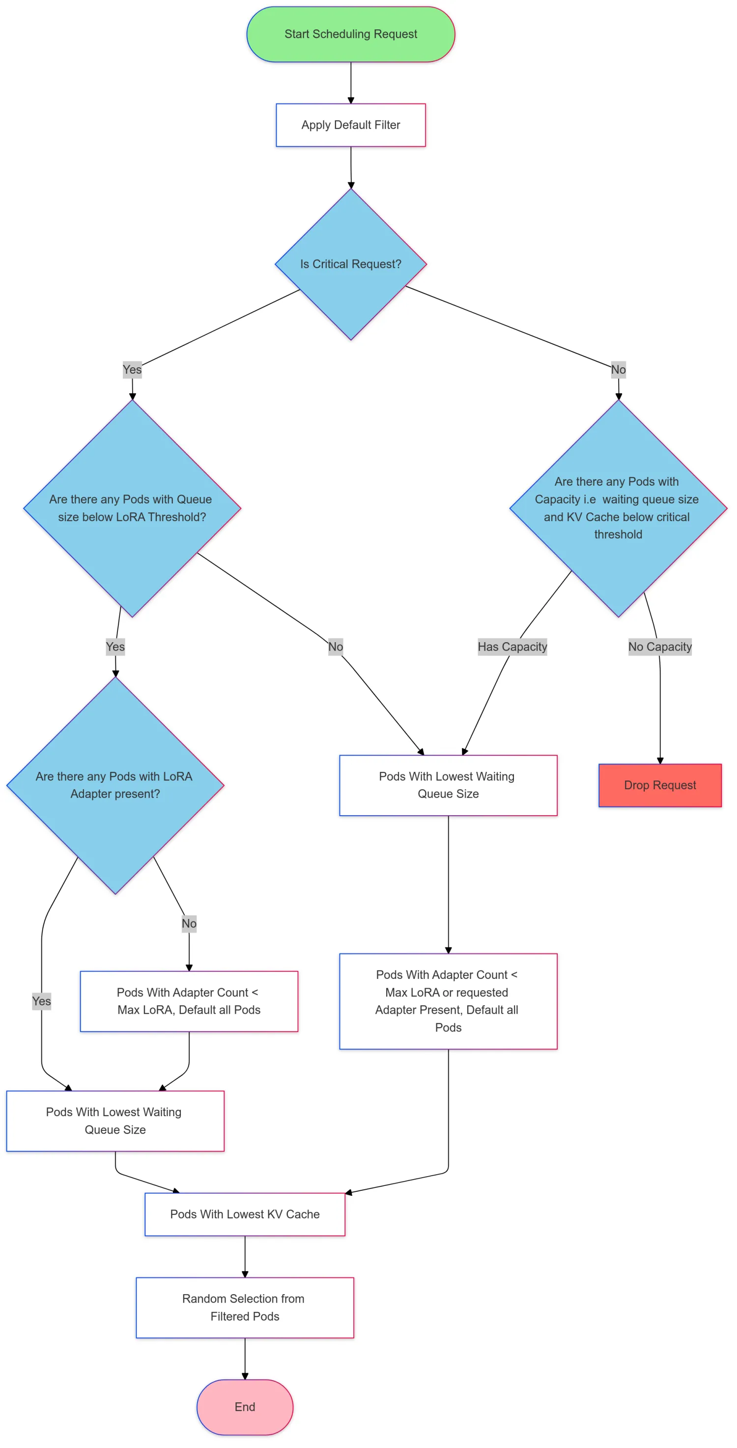 目前基于metrics的负载均衡策略遵循了gateway-api-inference-extension的pod选取算法,根据LoRA Adaotor亲和、队列长度、KV Cache使用率进行负载均衡,选取过程如下图所示: