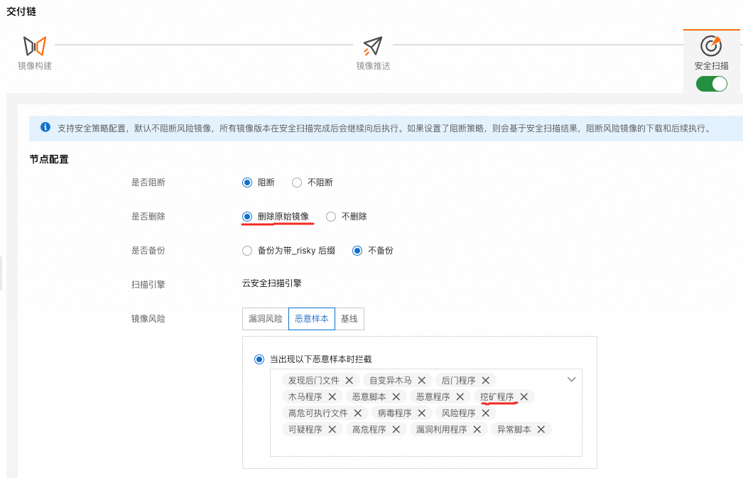 基于阿里云容器镜像服务的云原生交付链功能,可以在镜像推送之后,立即进行恶意脚本扫描,如若发现风险可以立即删除镜像。