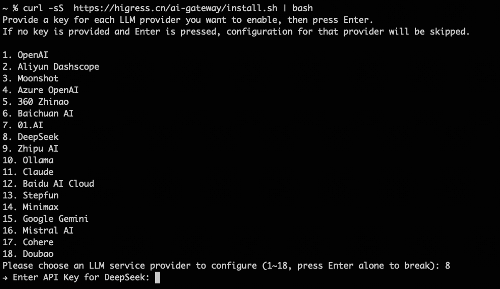 curl -sS https://higress.cn/ai-gateway/install.sh | bash注意:AI 网关的启动过程需要访问公网资源。请确保其运行环境具备外网访问条件。