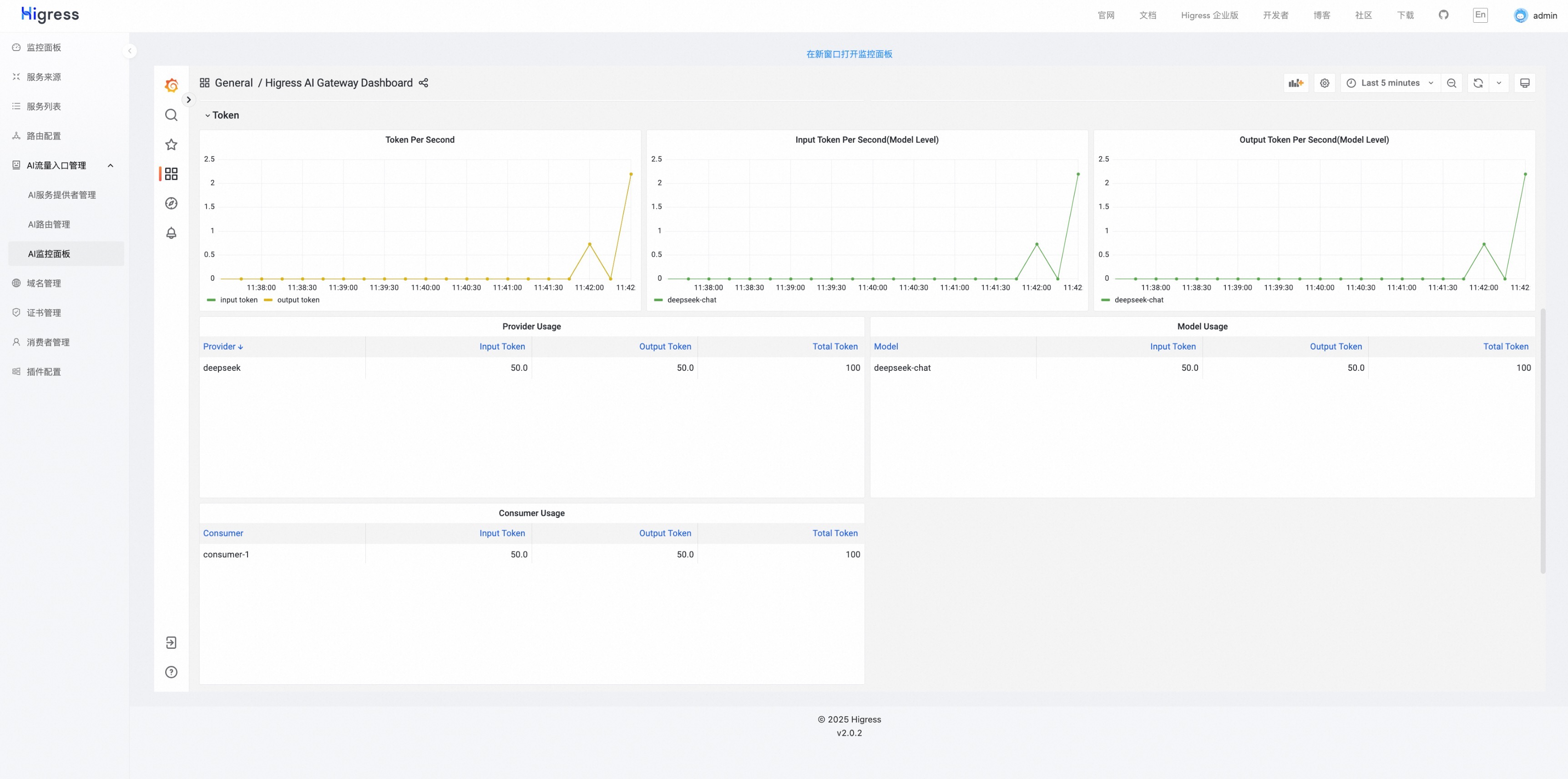 for chunk in completion: print(chunk.choices[0].delta)可以在监控面板看到每个模型,以及每个消费者的 token 消耗情况以及调用延时: