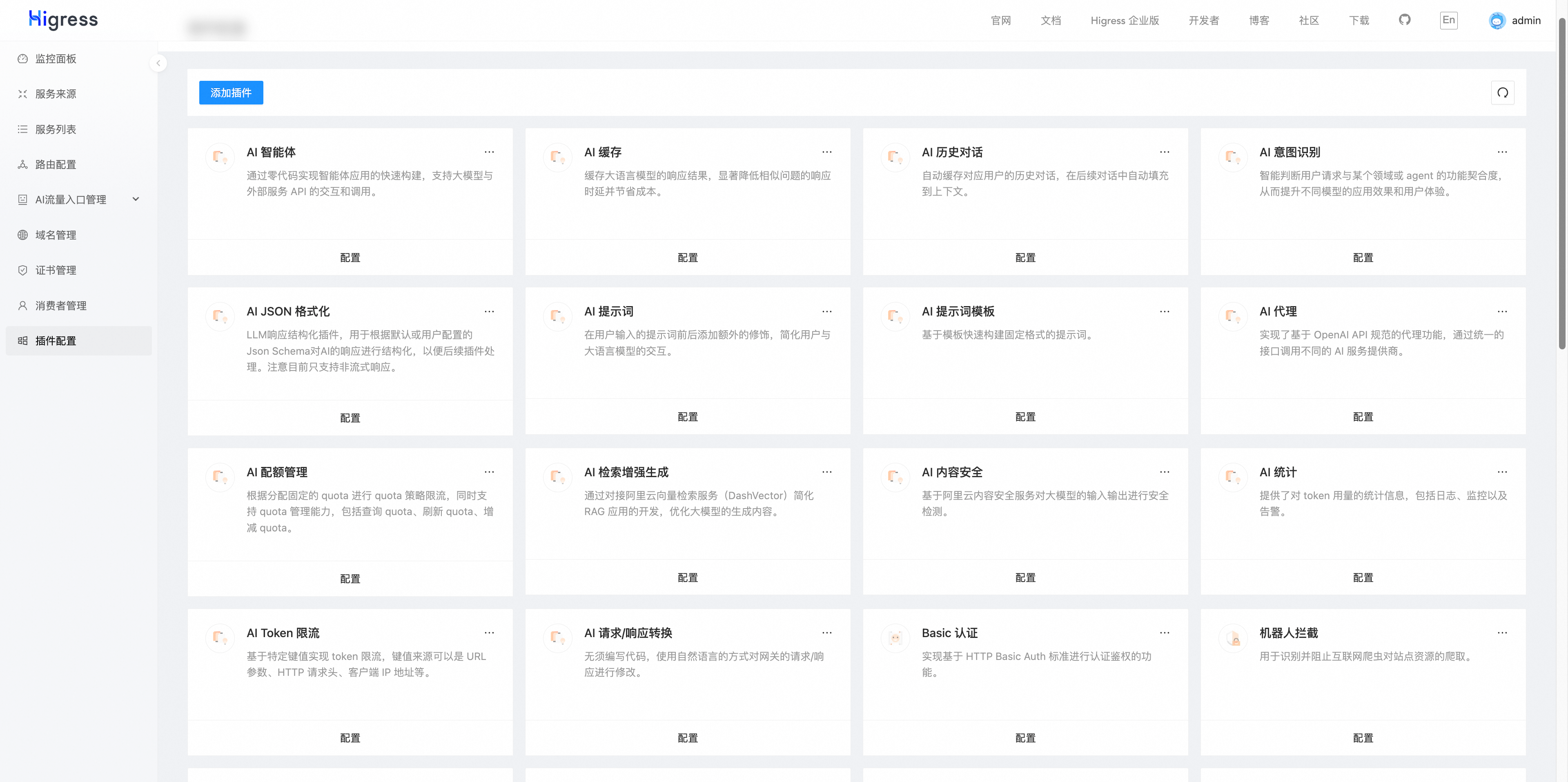 Higress 的插件市场里还有很多开箱即用的插件,例如提示词模版,AI 缓存,数据脱敏,内容安全等等: