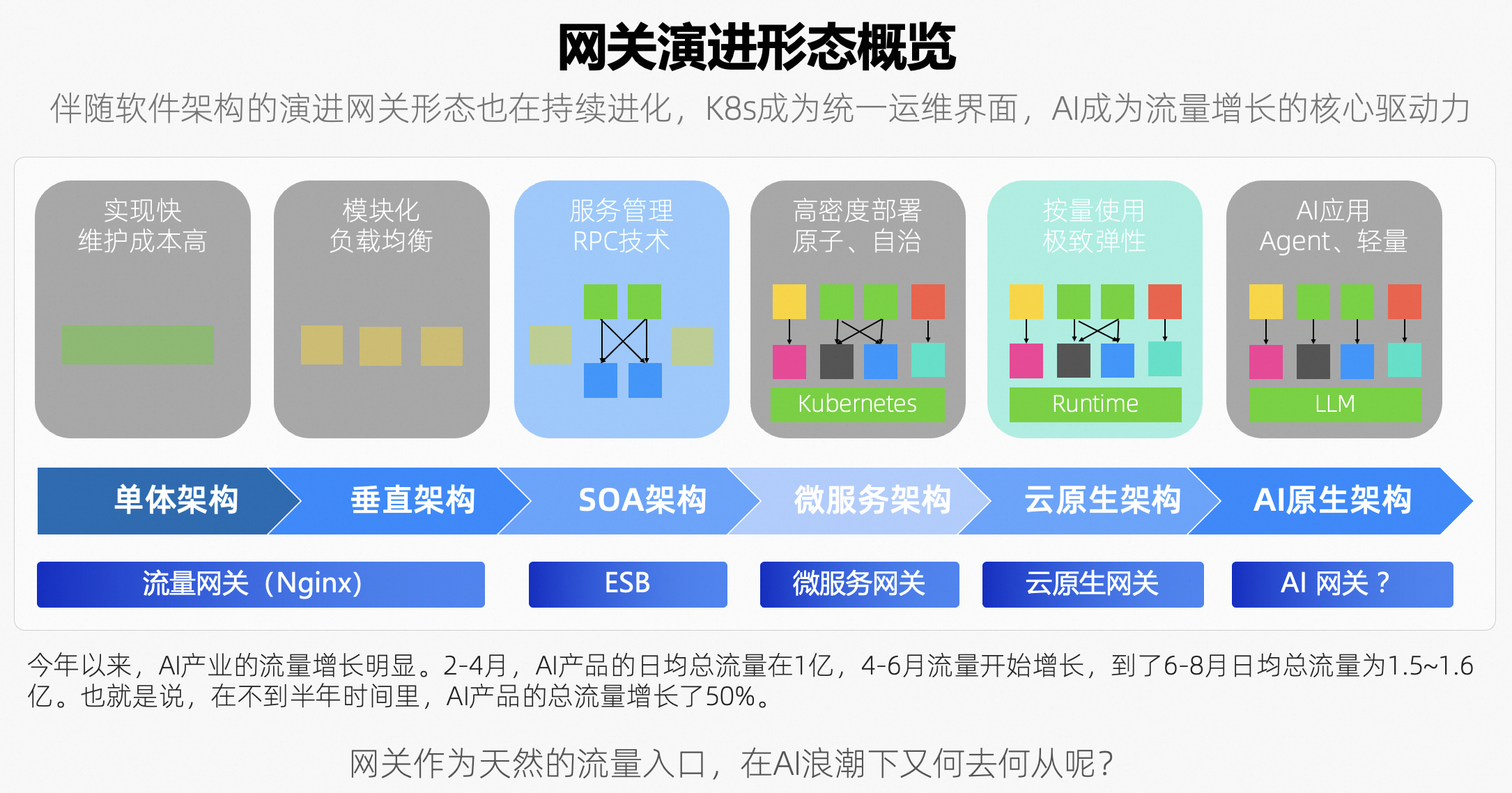 唯一不变的是变化,在现代复杂的商业环境中,企业的业务形态与规模往往处于不断变化和扩大之中。这种动态发展对企业的信息系统提出了更高的要求,特别是在软件架构方面。为了应对不断变化的市场需求和业务扩展,软件架构必须进行相应的演进和优化。网关作为互联网流量的入口,其形态也在跟随软件架构持续演进迭代中。我们下面就聊一聊网关的演进历程以及在时下火热的AI浪潮下,网关又会迸发怎样新的形态。