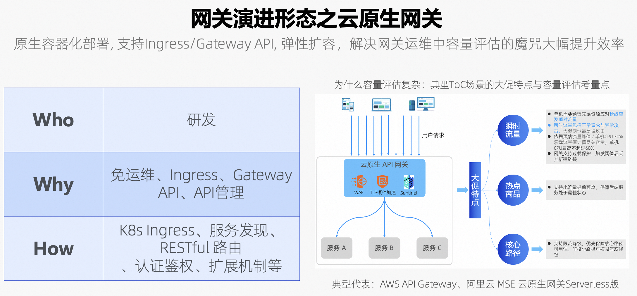 云原生网关是伴随 K8s 的广泛应用而诞生的一种创新网关,K8s 集群内外网络天然隔离的特性要求通过网关来将外部请求转发给集群内部服务,K8s 采用 Ingress/Gateway API 来统一网关的配置方式,同时 K8s 提供了弹性扩缩容来帮助用户解决应用容量调度问题,基于此用户对网关产生了新的诉求:期望网关既能有流量网关的特性来处理海量请求,又具备微服务网关的特性来做服务发现与服务治理,同时要求网关也具备弹性扩缩容能力解决容量调度问题,能够让开发者能够专注于业务逻辑的实现,而无需担心底层架构的容量、维护和管理。