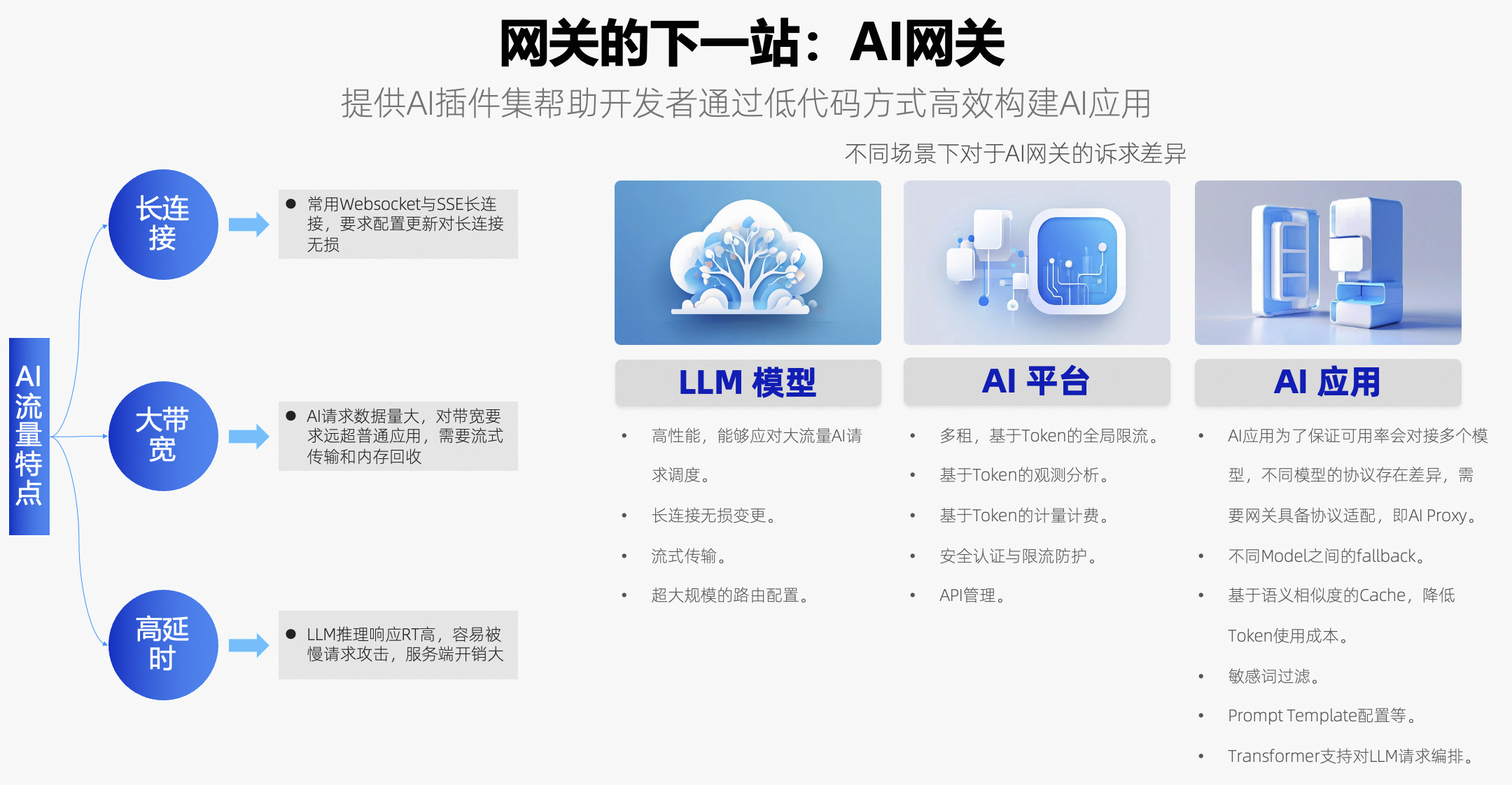 AI 网关是专为处理 AI 流量设计的关键组件,具备长连接、大带宽、高延时的特性,能够高效管理和优化数据传输。在 AI 应用、AI 平台和大型语言模型(LLM)中,不同的场景对 AI 网关的性能和功能有着多样化的需求。为更好地满足这些需求,AI 网关提供了丰富的AI插件集,开发者可以通过低代码方式轻松集成和构建复杂的 AI 应用。这不仅大幅降低了开发难度,还显著提高了效率,使得 AI 技术在各类应用和平台中更加易用和普及。AI 网关因此成为推动AI创新和应用落地的核心推动力。