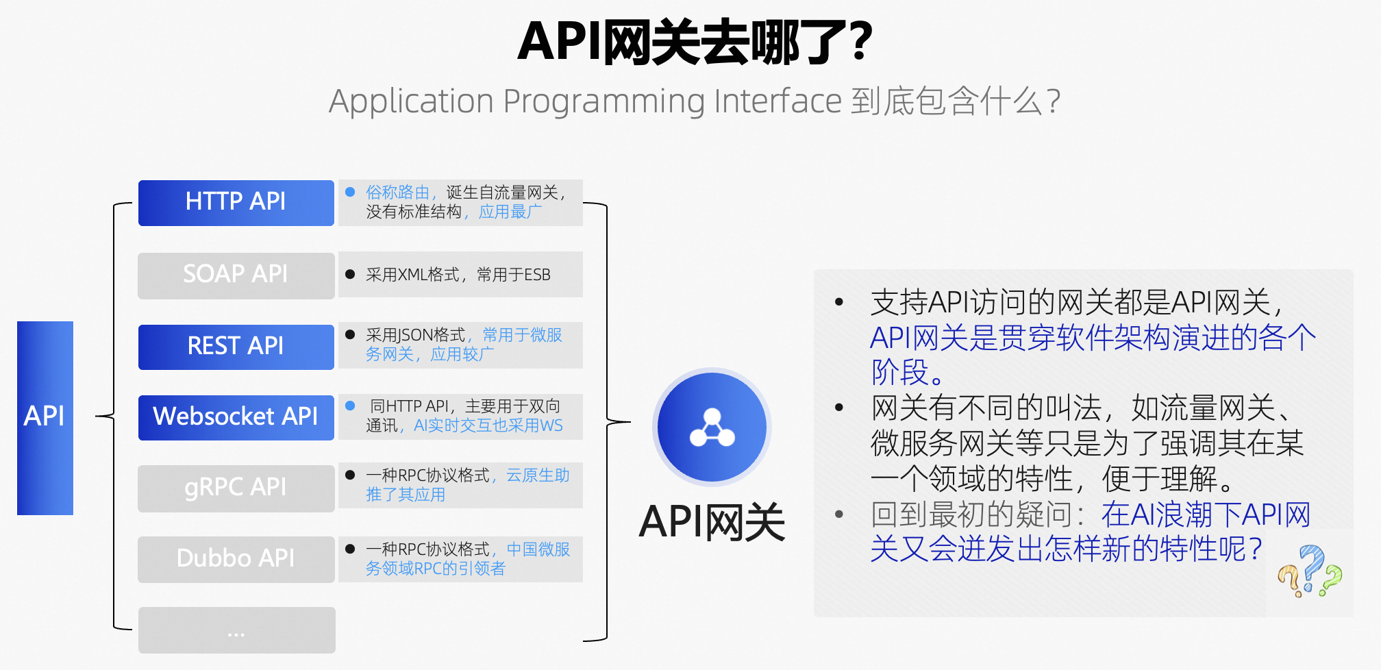 读到这里的同学可能会有这么一个问题:API 网关去哪了?我们耳熟能详的API网关为什么没有提到呢?回答这个问题之前我们可以先问自己一个问题:API 是什么?API 包含什么?