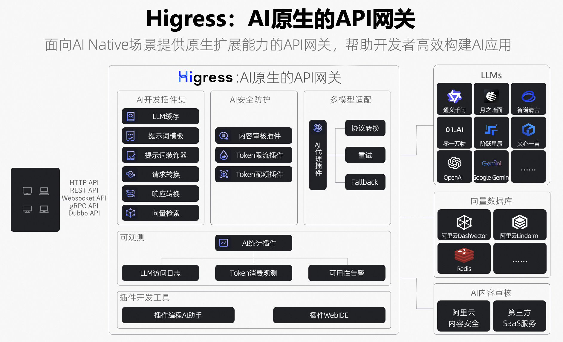 AI 网关是专为处理 AI 流量设计的关键组件,具备长连接、大带宽、高延时的特性,能够高效管理和优化数据传输。在 AI 应用、AI 平台和大型语言模型(LLM)中,不同的场景对 AI 网关的性能和功能有着多样化的需求。为更好地满足这些需求,AI 网关提供了丰富的AI插件集,开发者可以通过低代码方式轻松集成和构建复杂的 AI 应用。这不仅大幅降低了开发难度,还显著提高了效率,使得 AI 技术在各类应用和平台中更加易用和普及。AI 网关因此成为推动AI创新和应用落地的核心推动力。