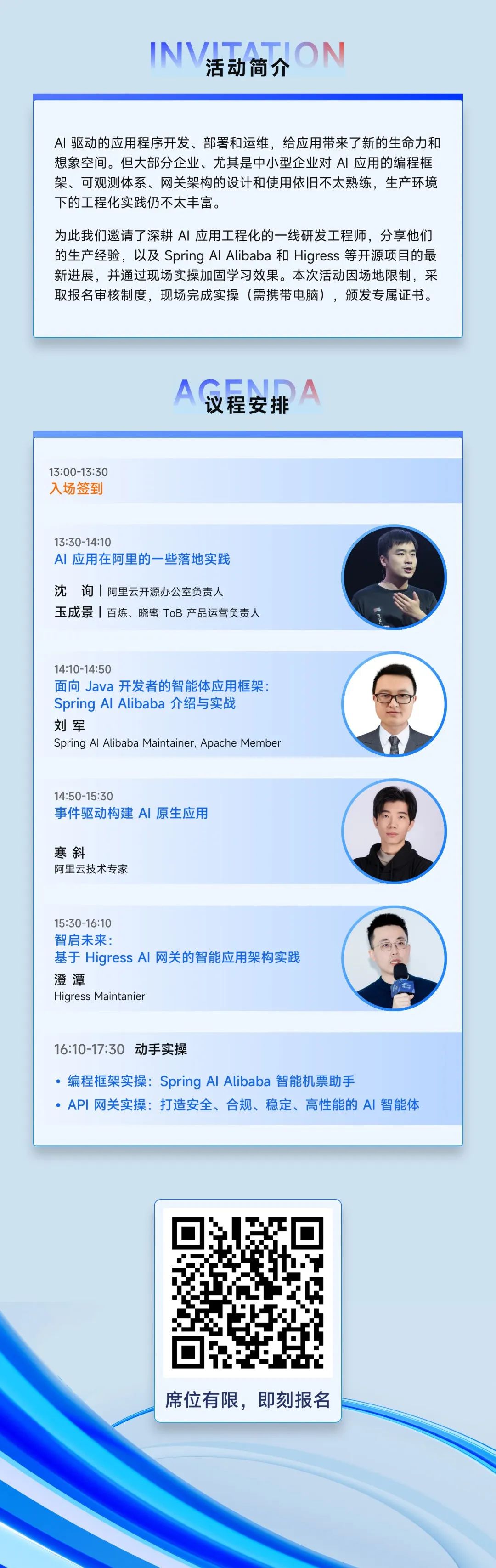 Al 驱动的应用程序开发、部署和运维,给应用带来了新的生命力和想象空间。但大部分企业、尤其是中小型企业对 Al 应用的编程框架、可观测体系、网关架构的设计和使用依旧不太熟练,生产环境下的工程化实践仍不太丰富。为此我们邀请了深耕 Al 应用工程化的一线研发工程师,分享他们的生产经验,以及 Spring Al Alibaba 和 Higress 等开源项目的最新进展,并通过现场实操加固学习效果。本次活动因场地限制,采取报名审核制度,现场完成实操(需携带电脑),颁发专属证书。