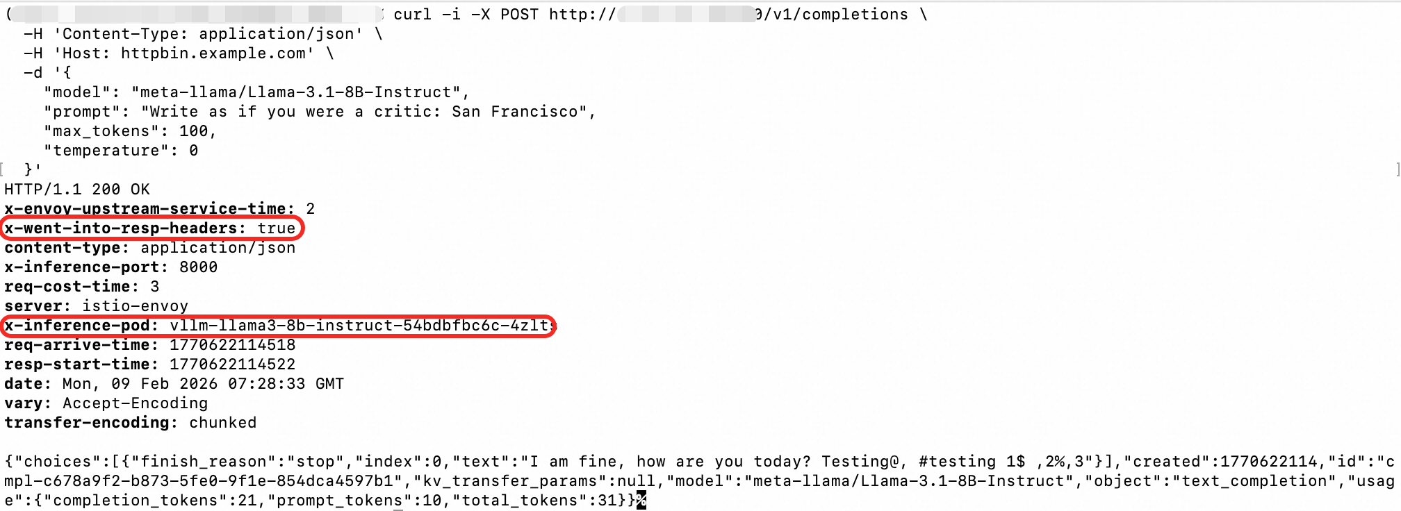 curl -i -X POST http://{higress-endpoint}:80/v1/completions \ -H 'Content-Type: application/json' \ -H 'Host: httpbin.example.com' \ -d '{ "model": "meta-llama/Llama-3.1-8B-Instruct", "prompt": "Write as if you were a critic: San Francisco", "max_tokens": 100, "temperature": 0 }'