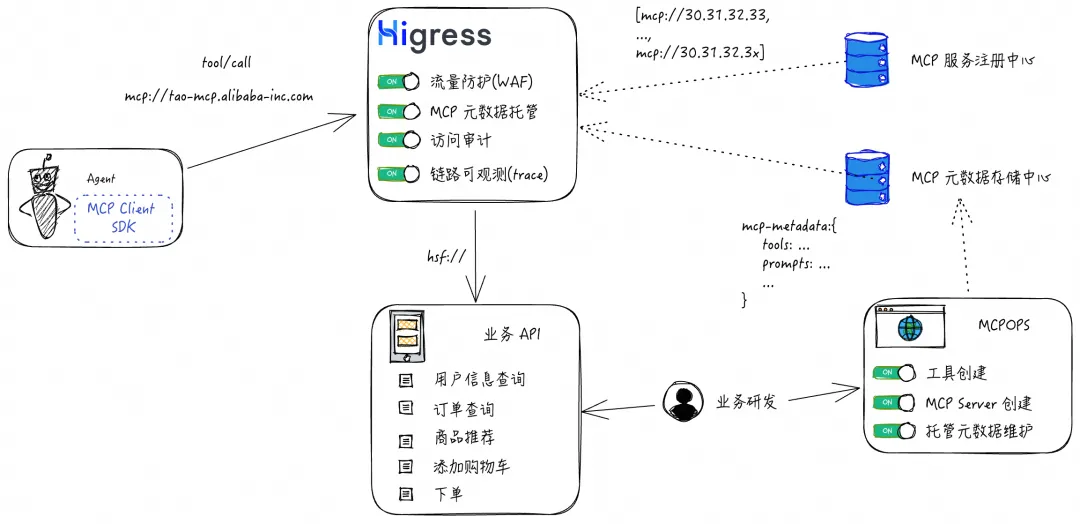 - Higress 网关:承接 MCP 流量,提供统一身份认证、流量调度、参数映射、安全审计等切面能力。