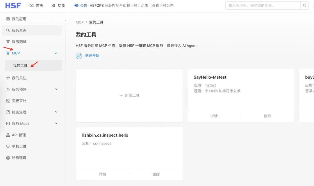 step1 :打开对应环境的 HSFOPS 后台,选择 MCP 侧边栏
