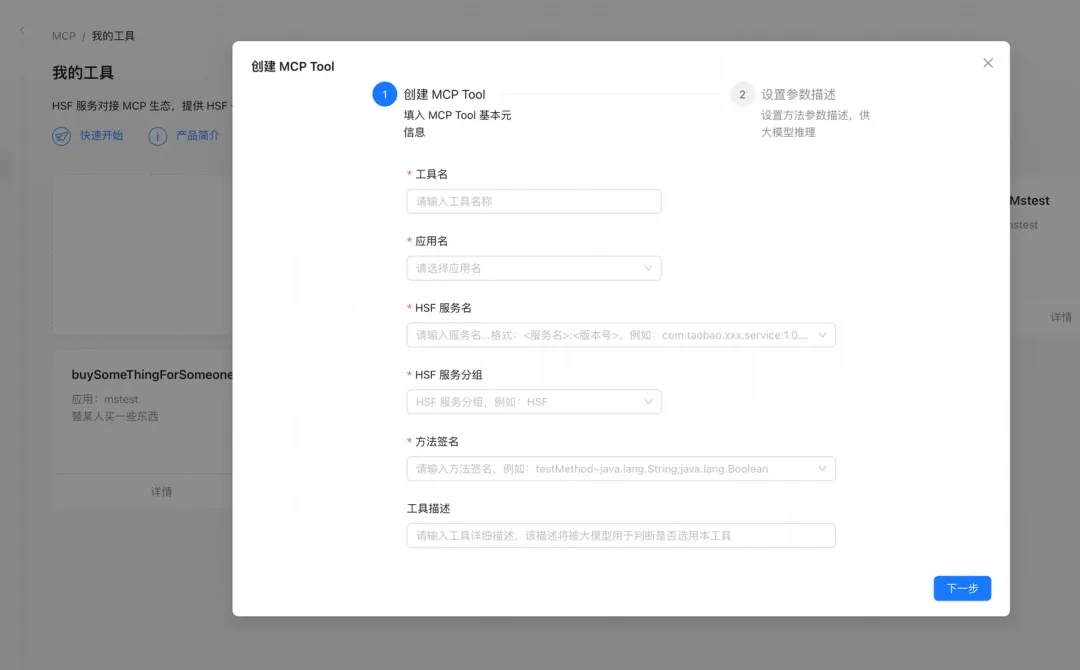 step2:选择需要转 MCP Tool 的 hsf 应用(自己为 owner/ops 的应用)、服务名和方法名。