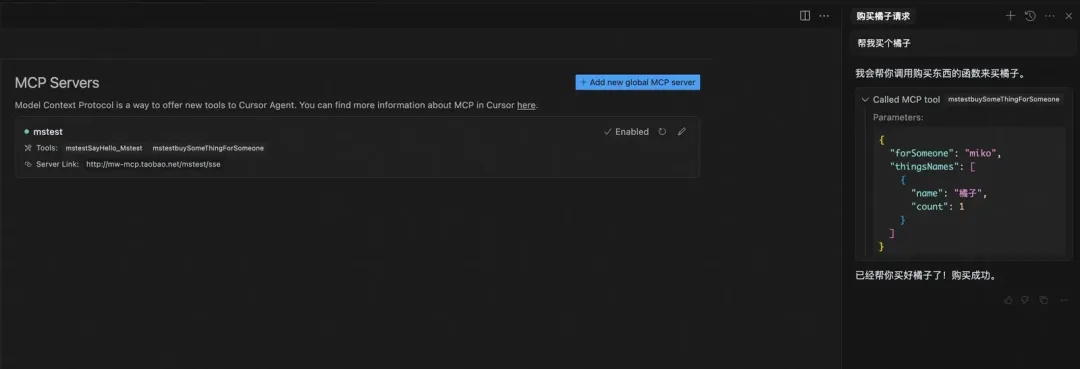 { "mcpServers": { "{applicationName}": { "url": "http://{MCP endpoint prefix}/{applicationName}/sse" } }}实际效果