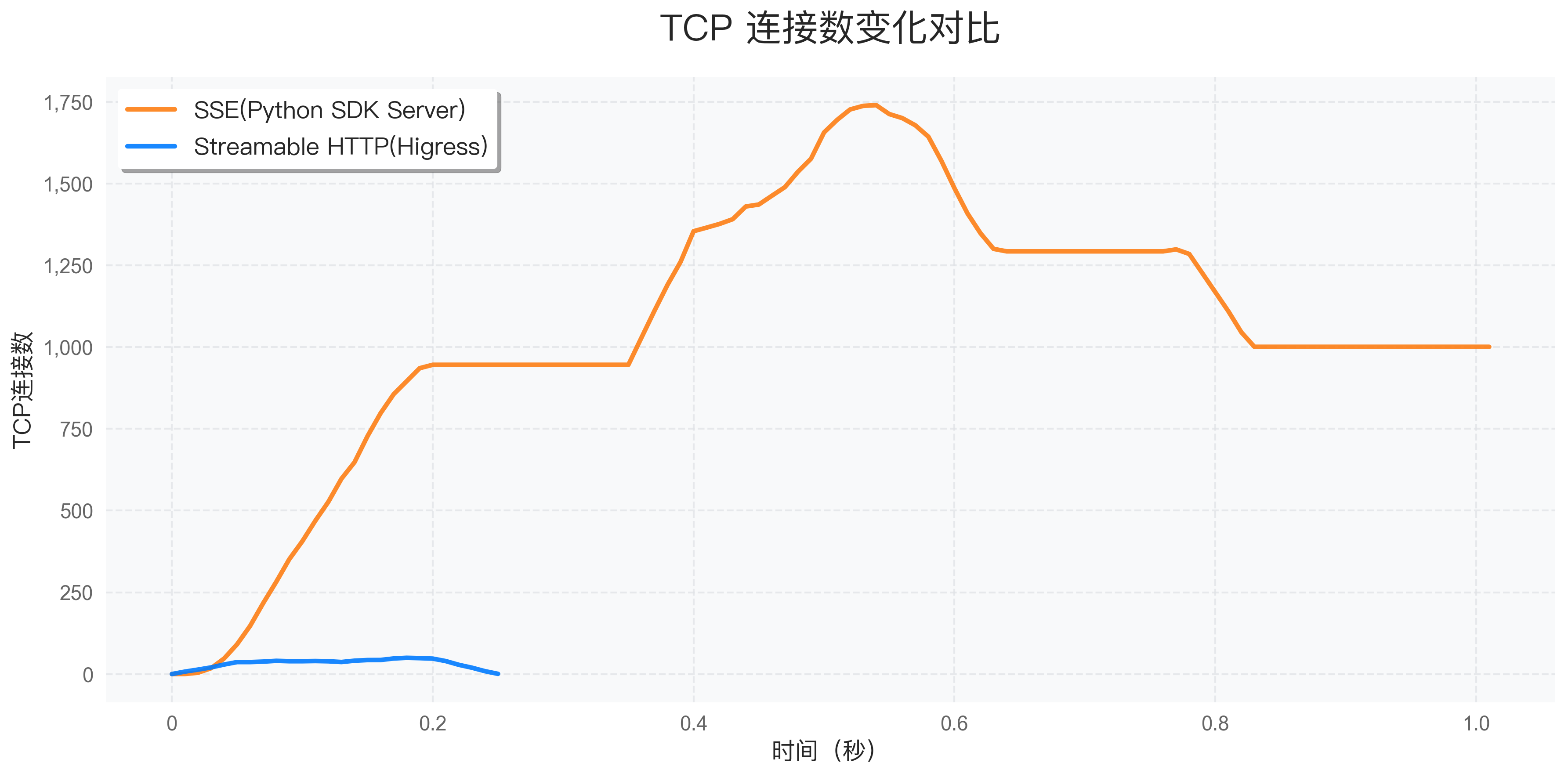 在1000个并发用户的测试场景下,Higress 部署的 Streamable HTTP 方案的 TCP 连接数明显低于 HTTP + SSE 方案: