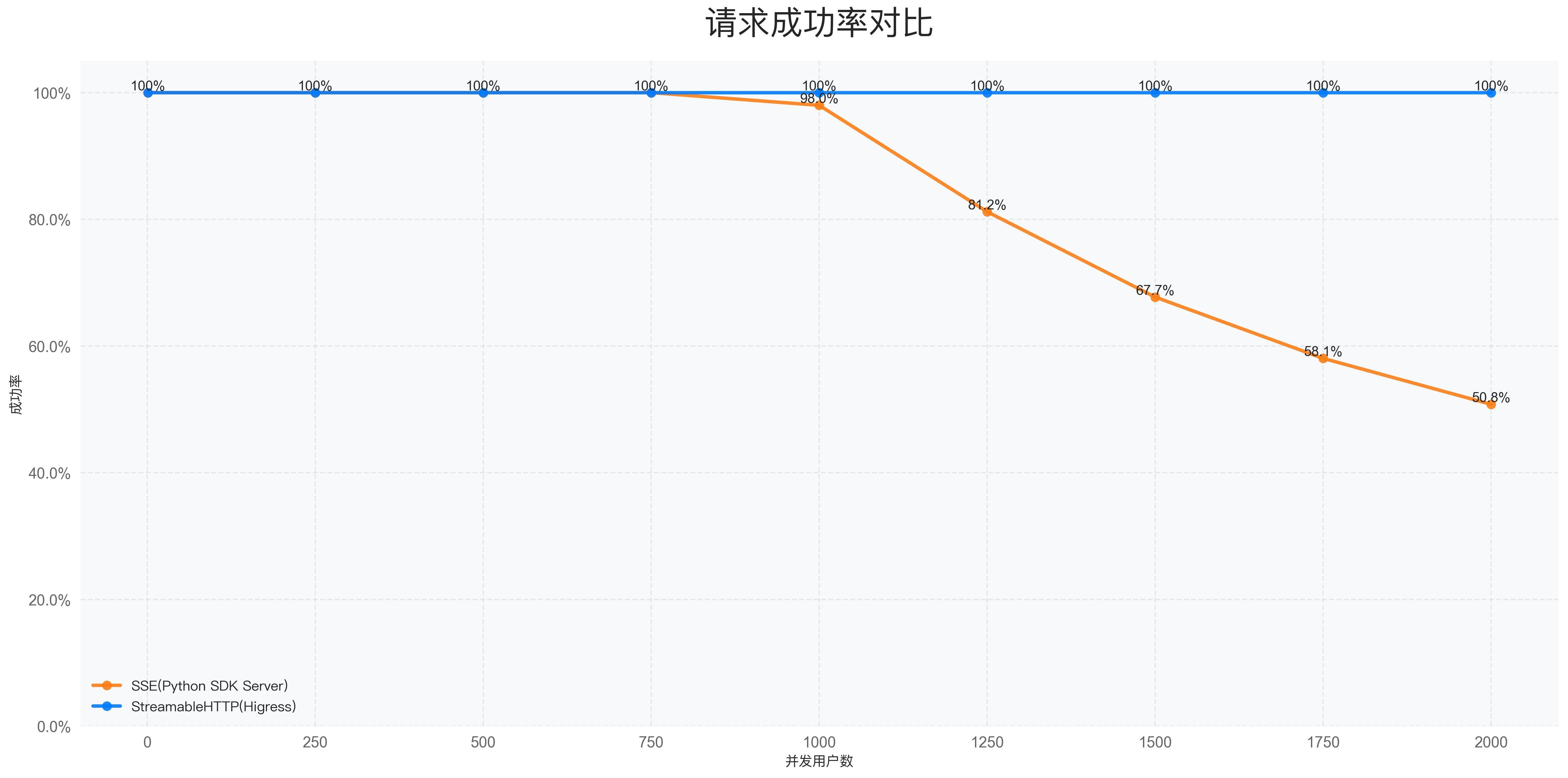 - HTTP + SSE:随着并发用户数增加,成功率显著下降