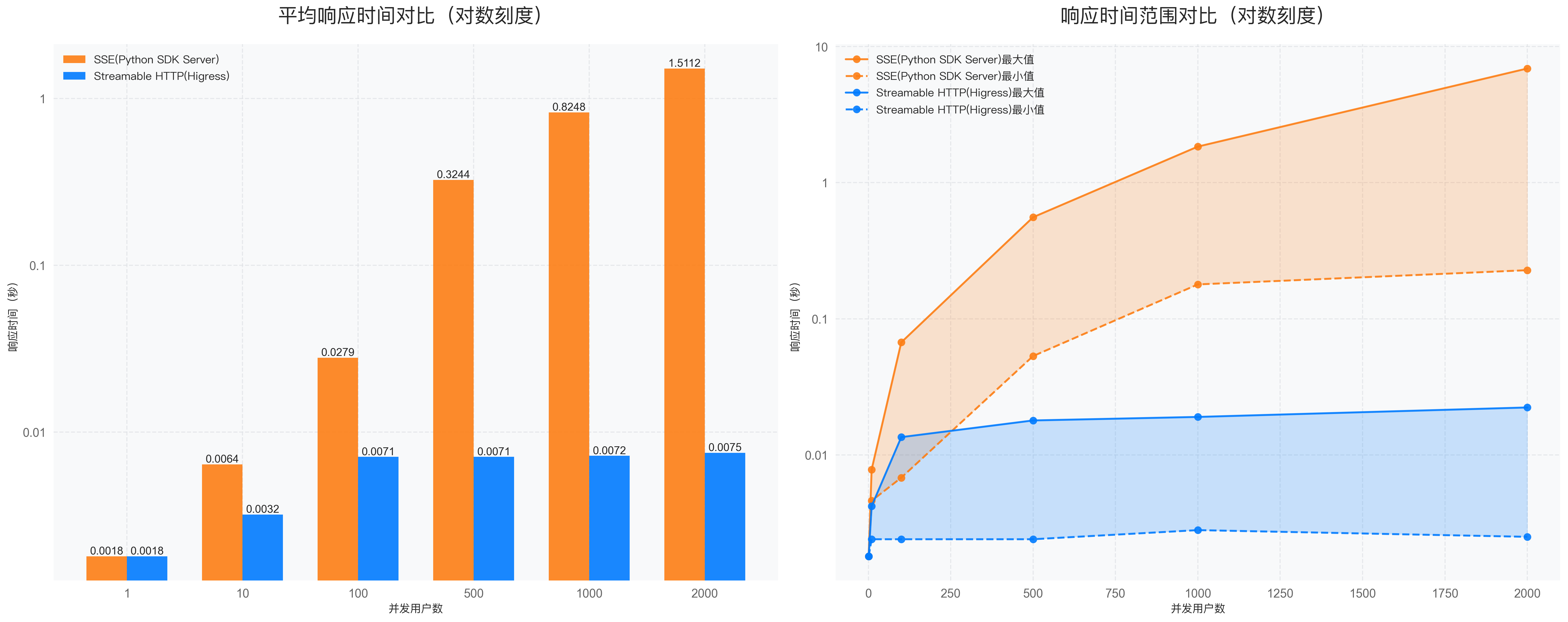 利用 Python 程序模拟不同数量的用户同时并发访问远程的 MCP Server 并调用获取工具列表,并统计调用返回响应的时间,图中给出的响应时间对比为对数刻度,SSE Server 在并发用户数量较多时平均响应时间会从0.0018s显著增加到1.5112s,而 Higress 部署的 Streamable HTTP Server 则依然维持在0.0075s的响应时间,也得益于 Higress 生产级的性能相比于 Python Starlette框架。