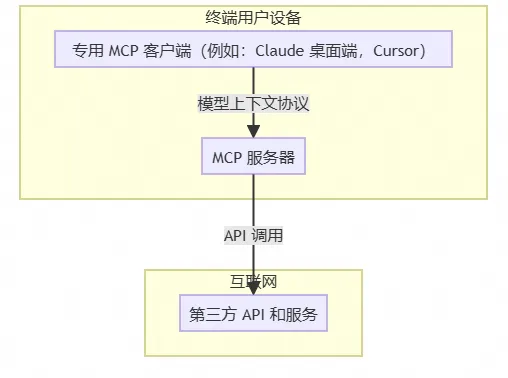Local MCP Server 是指在用户本地设备上运行的 MCP 服务器。在这种模式下,MCP 客户端(如Claude Desktop或Cursor)通过本地进程通信(stdin/stdout)与 MCP 服务器交互,服务器再连接到互联网上的各种 API 和服务。这种架构简单直接,适合个人开发者使用,但存在一些局限性。