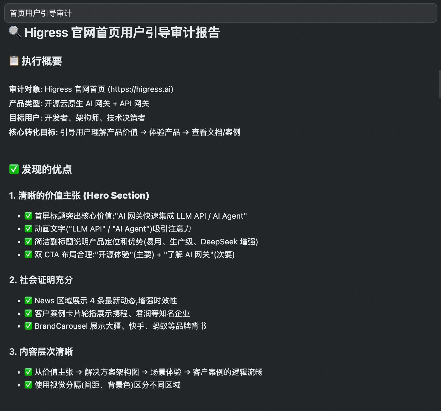 AI 生成的审核报告会识别出首页在价值主张、CTA 层次、信任信号等方面的不足,并提供具体的优化方案。