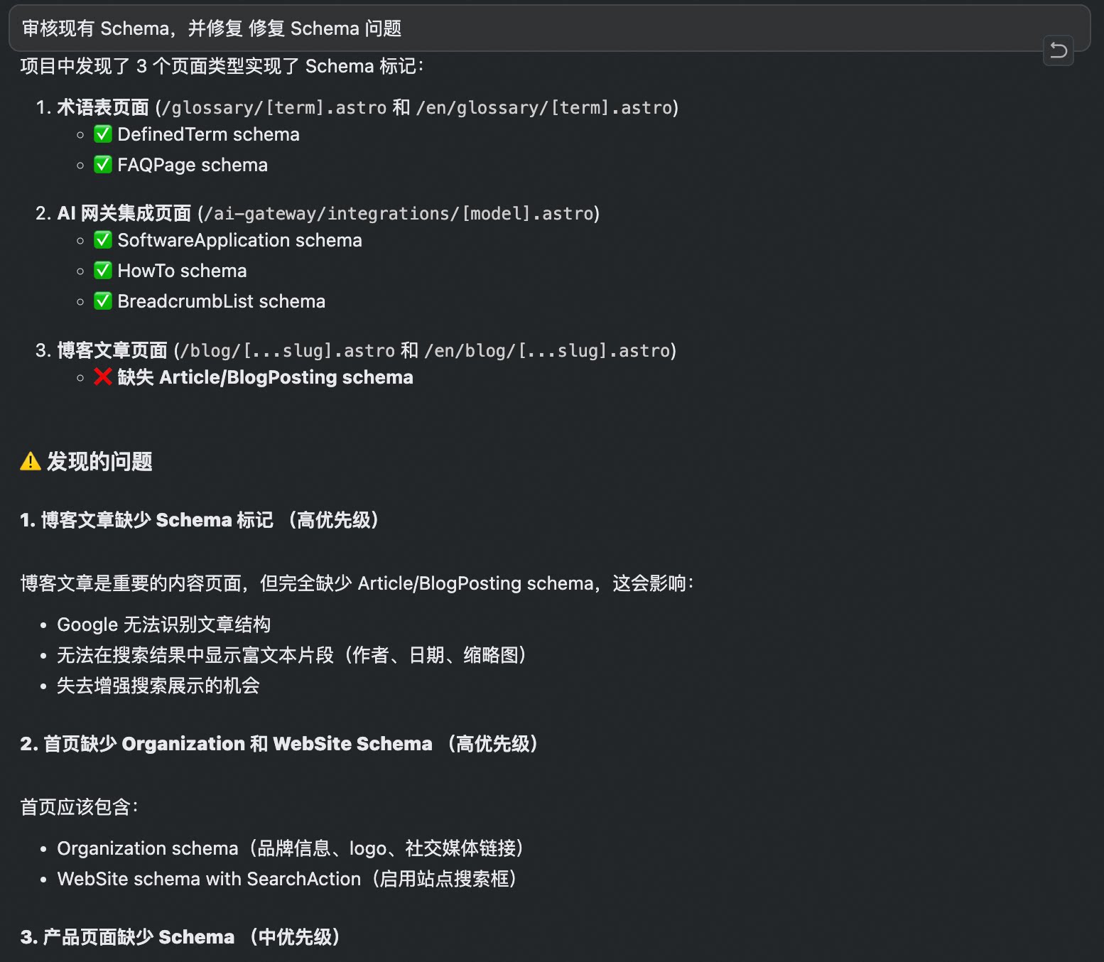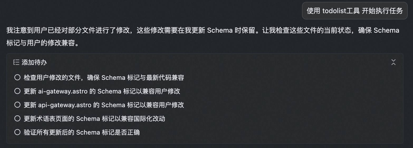 由于优化项较多,Agent 容易遗忘,根据 Manus 的经验,使用 todolist (add_tasks) 工具进行任务管理。通过 prompt “使用 todolist 工具开始执行任务”,AI 会创建任务列表并逐一完成 Article、SoftwareApplication、Organization、WebSite 等 Schema 的优化。