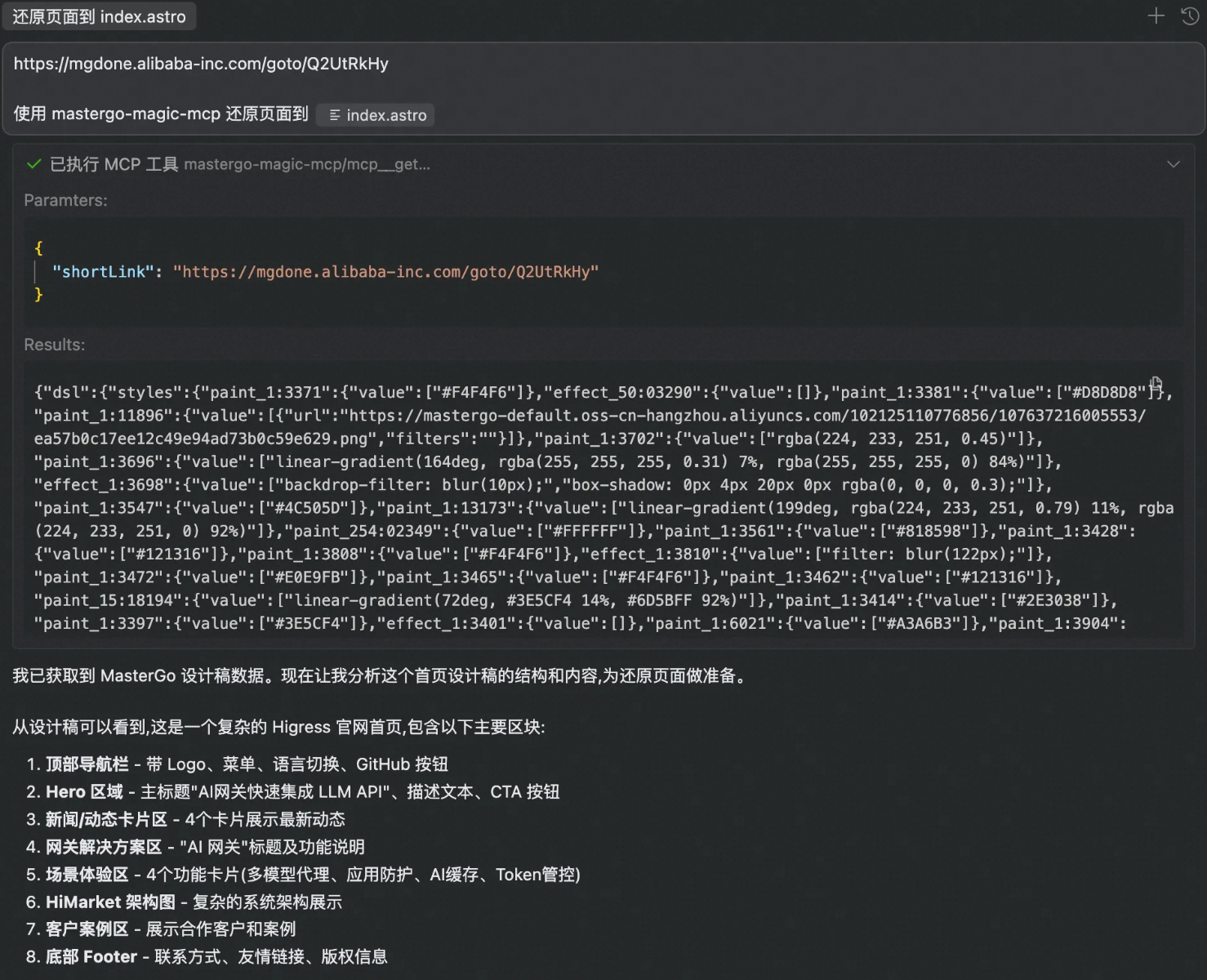 { "mcpServers": { "mastergo-magic-mcp": { "command": "npx", "args": [ "-y", "@mastergo/magic-mcp", "--token=<MG_MCP_TOKEN>", "--url=https://mastergo.com" ] } }}网页还原: