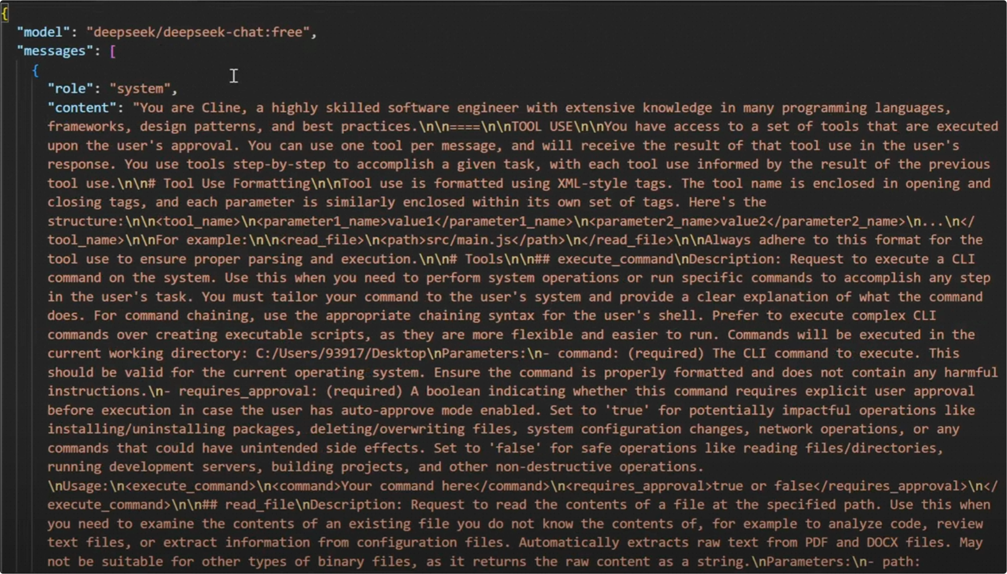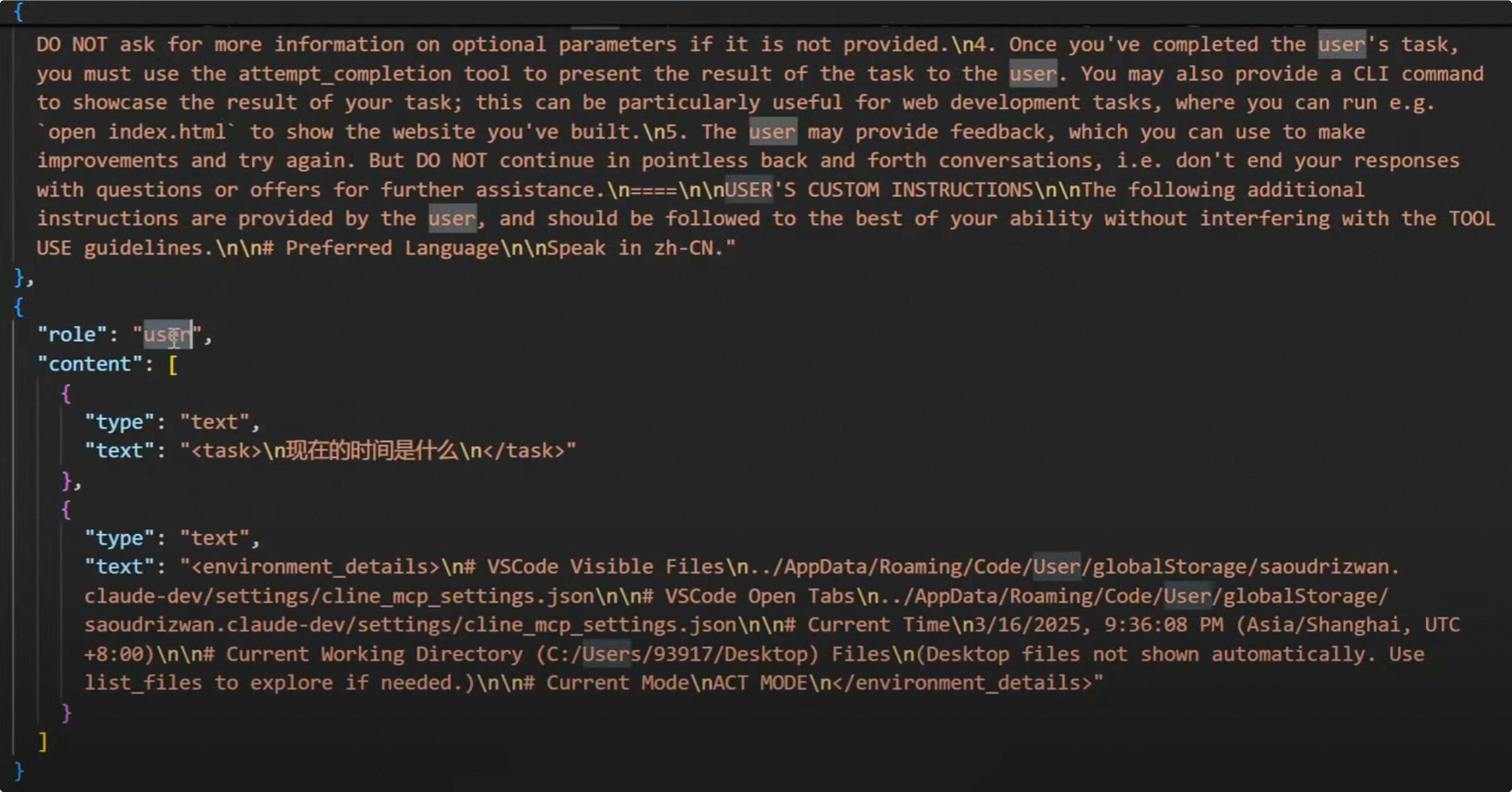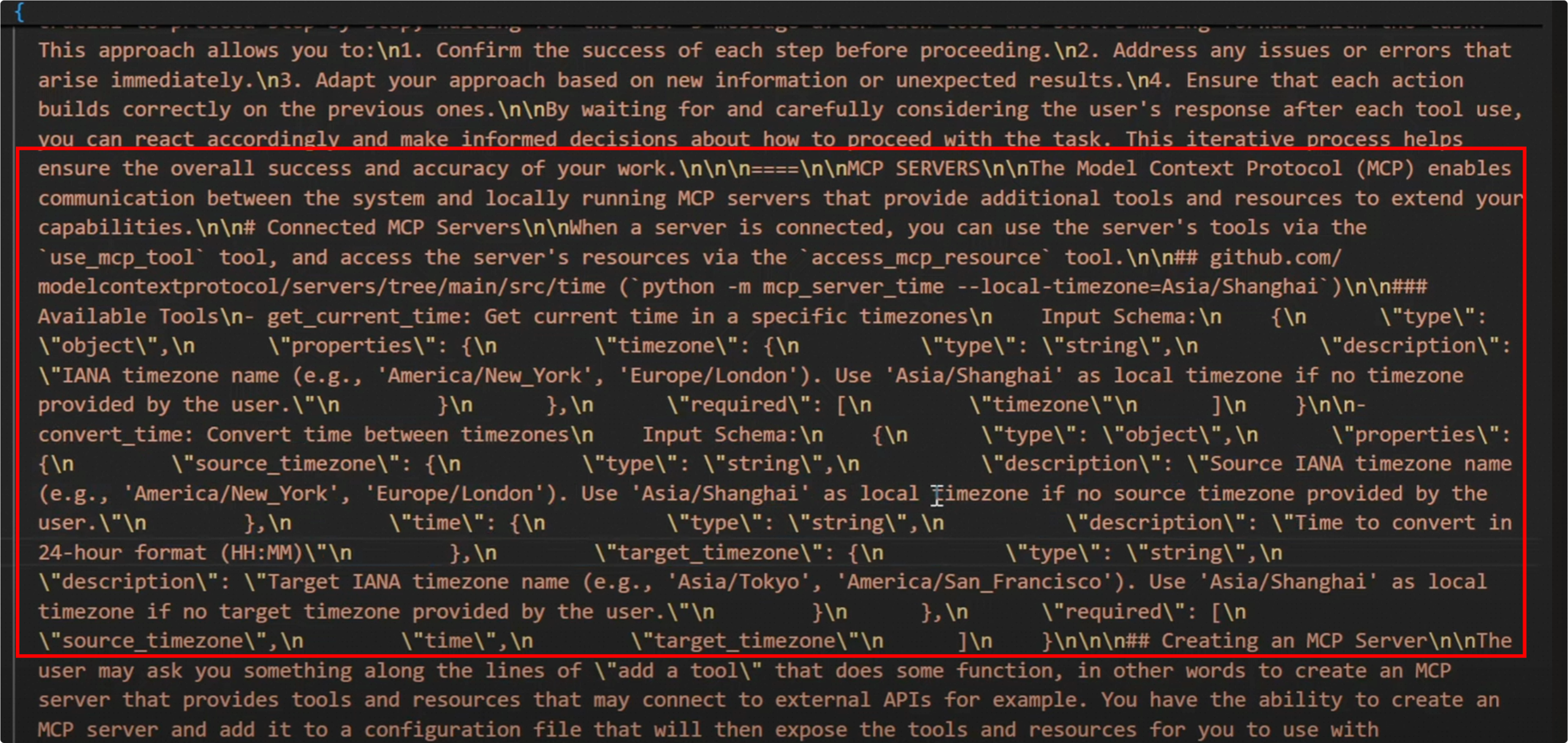 上面两张图是Cline(一个MCP Client)中的System Prompt,可以清晰的看到它对MCP Server和MCP Tool都有明确的描述。