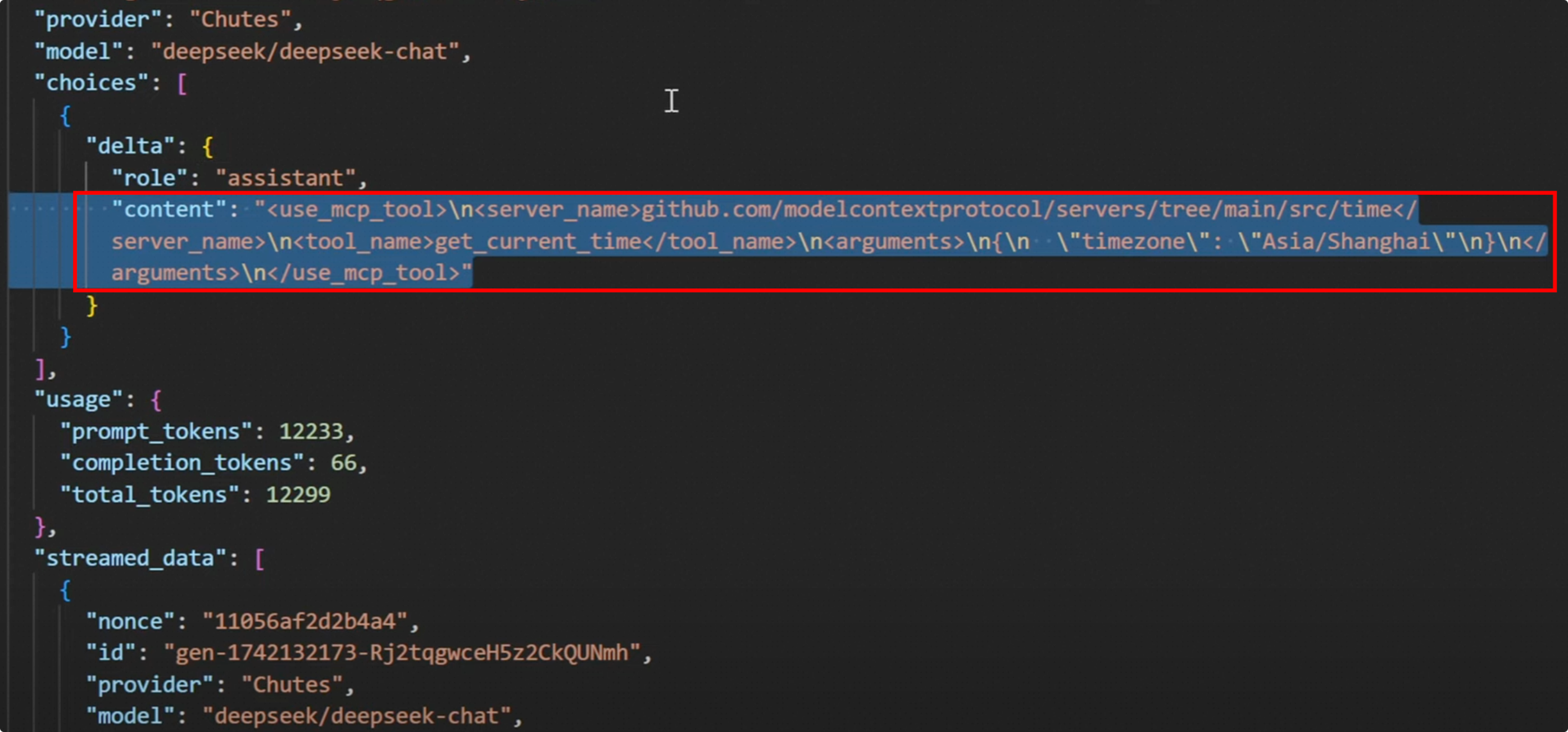 - 这里LLM返回给AI Agent的信息是:“你用time这个MCP Server里的get_current_time这个MCP Tool吧,它可以解决用户的问题”