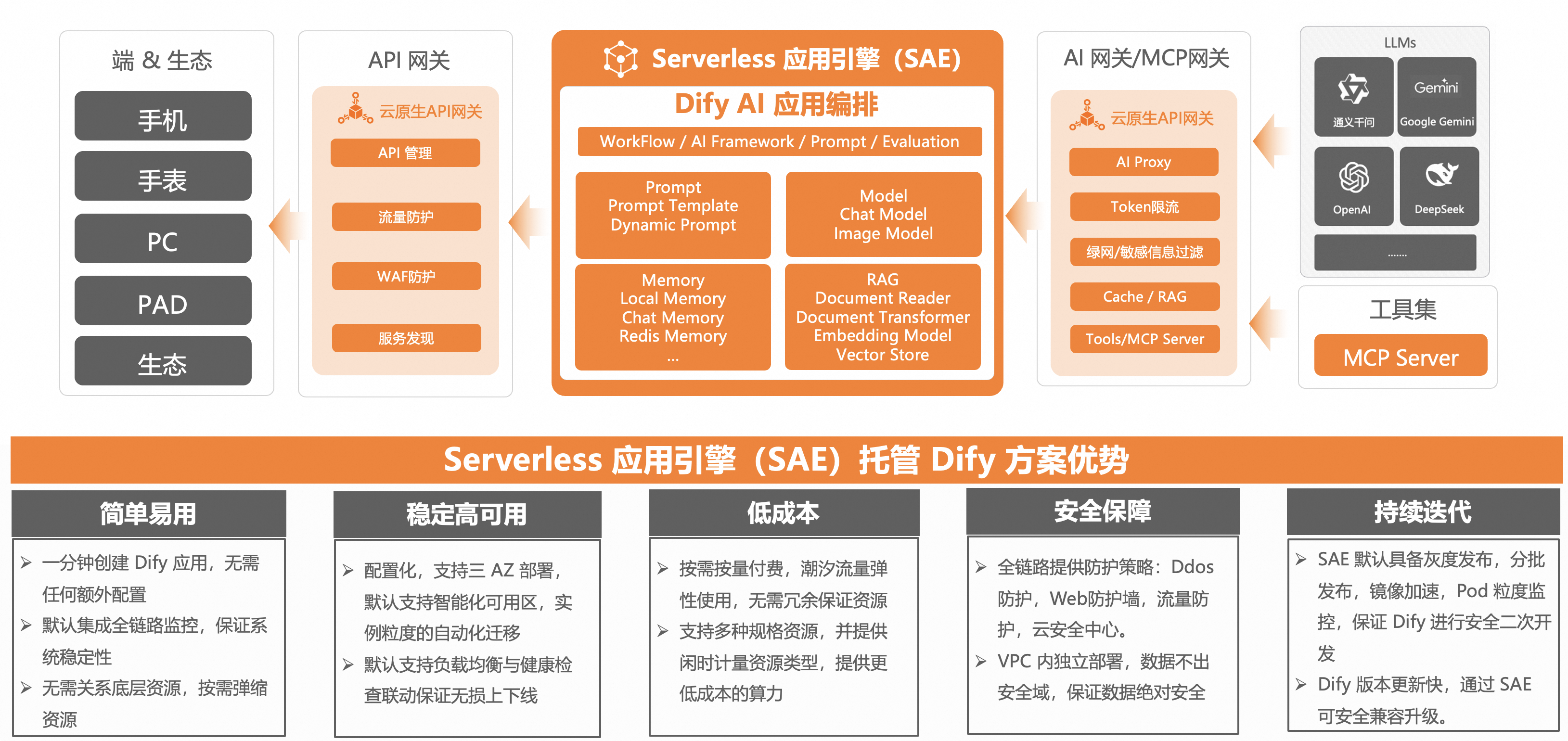 为了解决这些问题,阿里云上的Serverless PaaS类型的计算产品 Serverless应用引擎(SAE)做了企业生产级别的Dify托管部署方案,旨在解决上述问题,让企业在使用Dify的时候不用再关心稳定性、健壮性、性能这些问题。