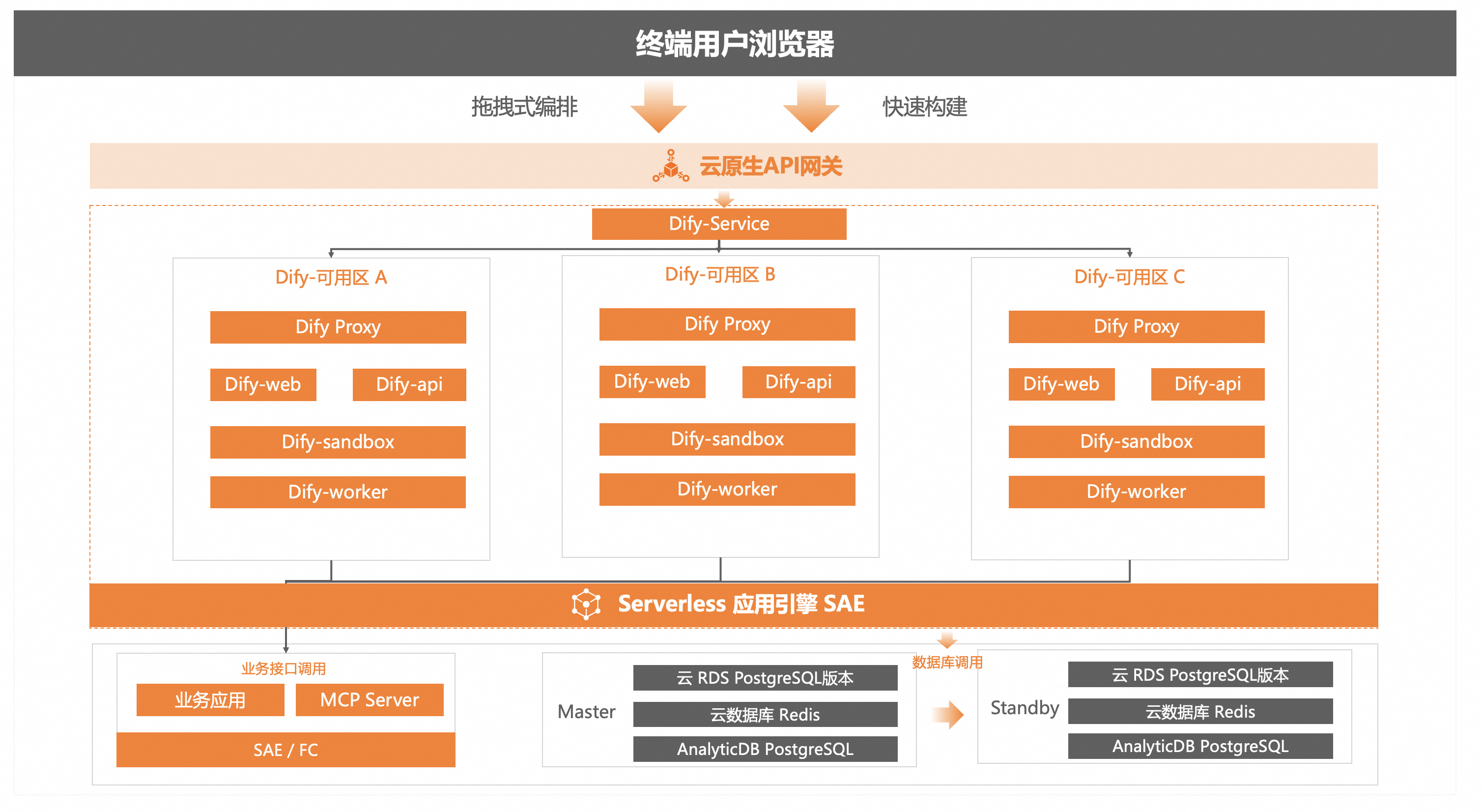 SAE部署Dify支持配置化,三AZ部署,实例粒度的自动化迁移,结合云原生API网关和SAE内置的服务治理能力,保障负载均衡稳定性,同时还支持Dify 6个核心服务的健康检查,以及无损上下线。