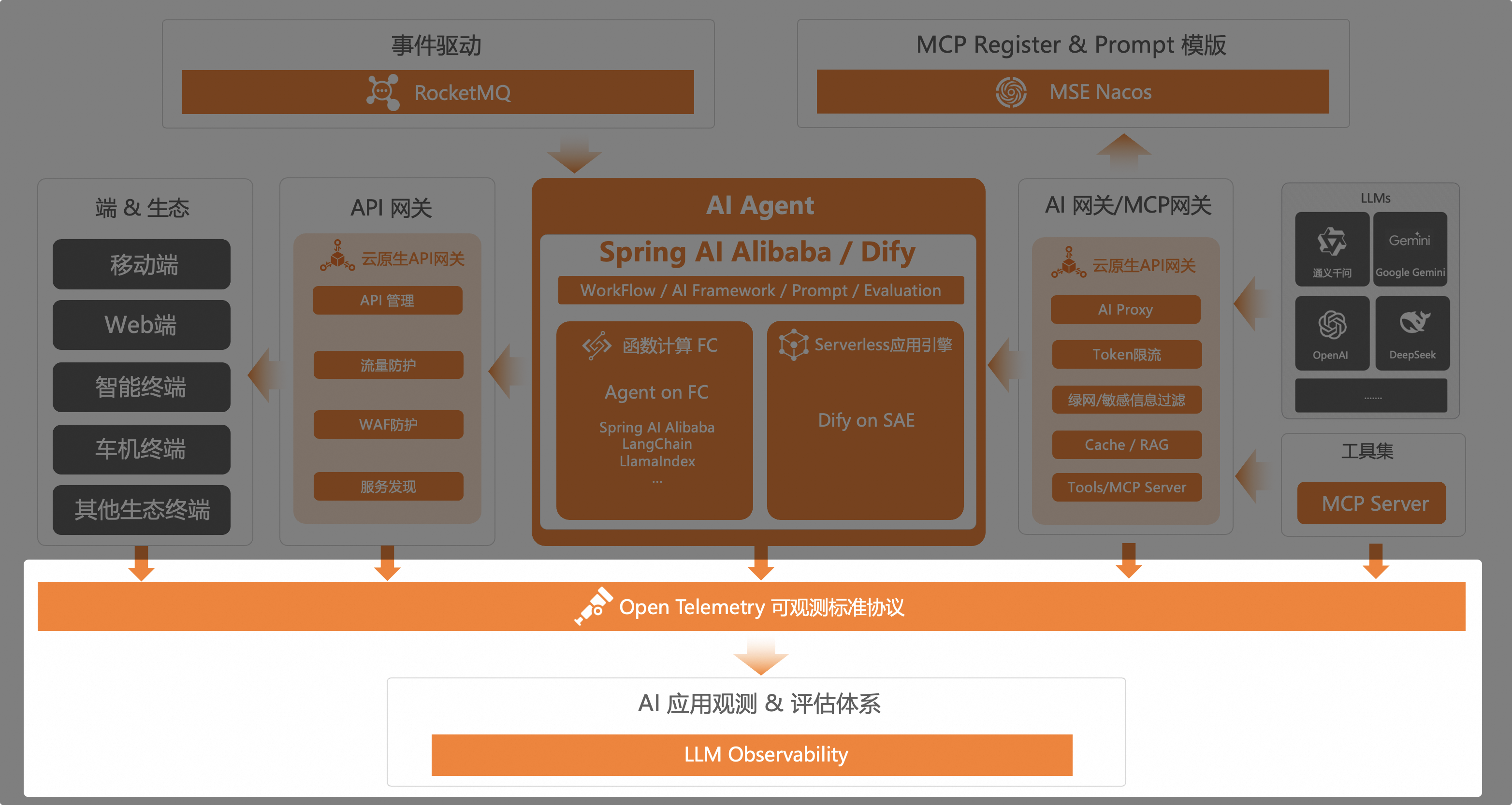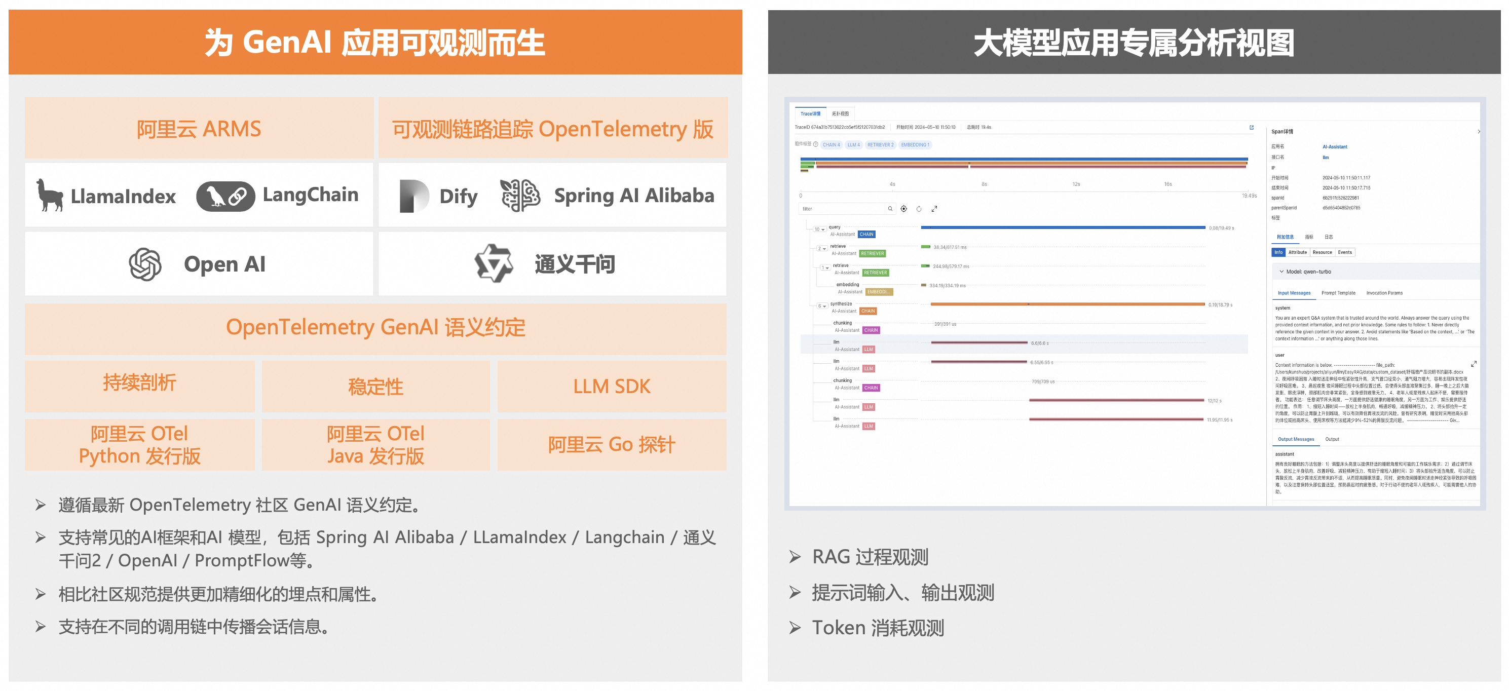 结合阿里云可观测产品ARMS,链路追踪OpenTelemetry,我们构建了AI应用全环节的可观测体系。