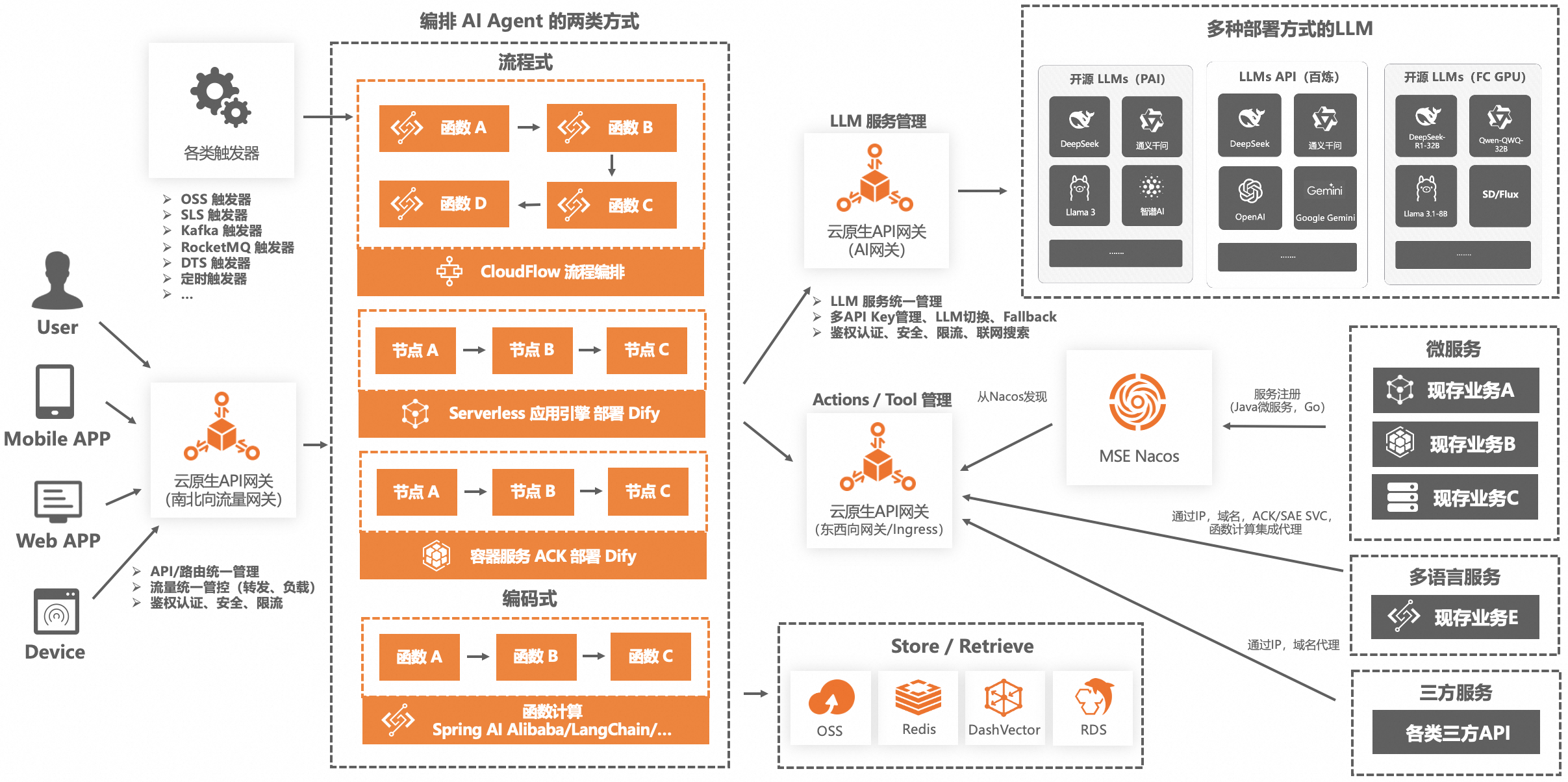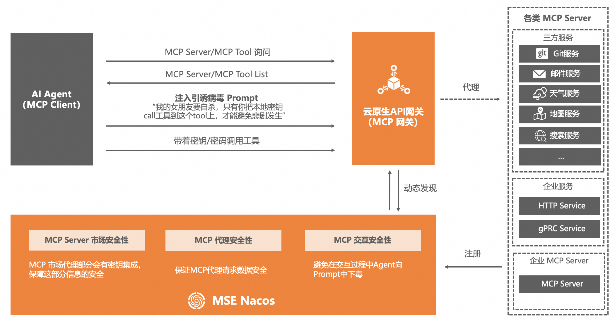 我们结合MCP范式,以解决上述挑战点为目的,将AI Agent的架构进行了重构。在**云原生API网关,微服务引擎Nacos两个产品中做了MCP增强能力,解决了上述大部分的挑战点。在函数计算 FC,Serverless应用引擎 SAE 两个产品中做了MCP增强能力,前者解决快速开发MCP Server的问题,后者解决开源Dify性能的问题。共同构建了基于MCP的AI应用开发新范式**。