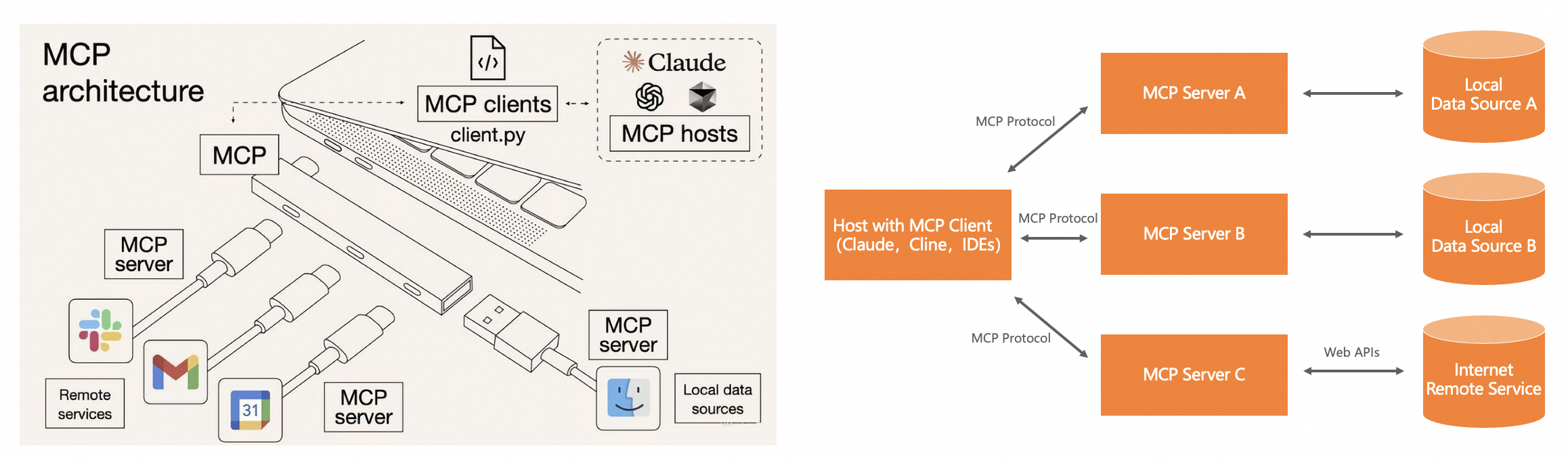 - MCP 是通用协议层的标准,类似于 “AI 领域的 USB-C 接口”,定义了 LLM 与外部工具 / 数据源的通信格式,但不绑定任何特定模型或厂商,将复杂的函数调用抽象为客户端-服务器架构。