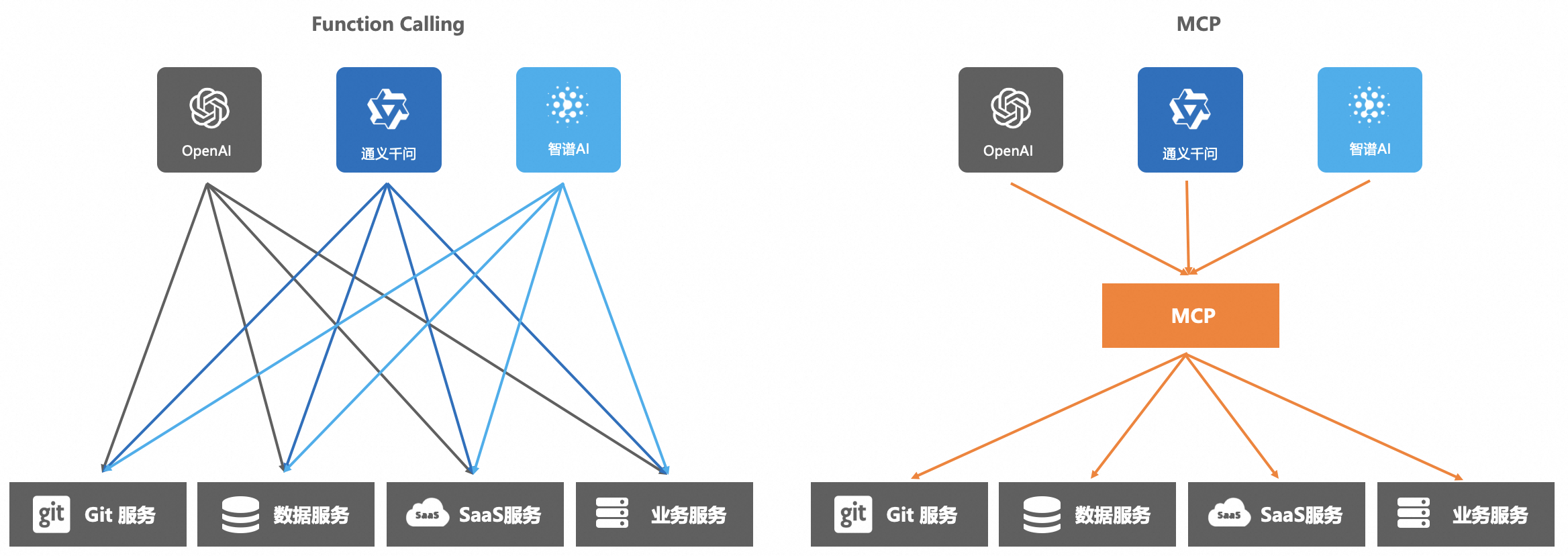 那么可能有小伙伴会问,MCP和LLM的Function Calling又有什么区别呢?核心区别是是否绑定模型或模型厂商: