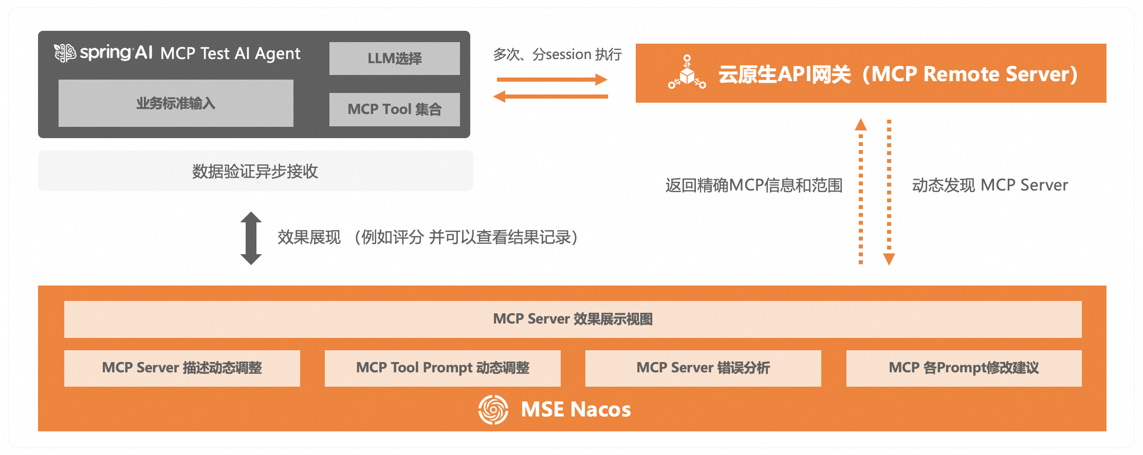 - 第三步:AI Agent无论以哪种方式实现,只要其中的节点需要获取数据,便向MCP网关(云原生API网关)请求获取可用的MCP Server及MCP Tool的信息。