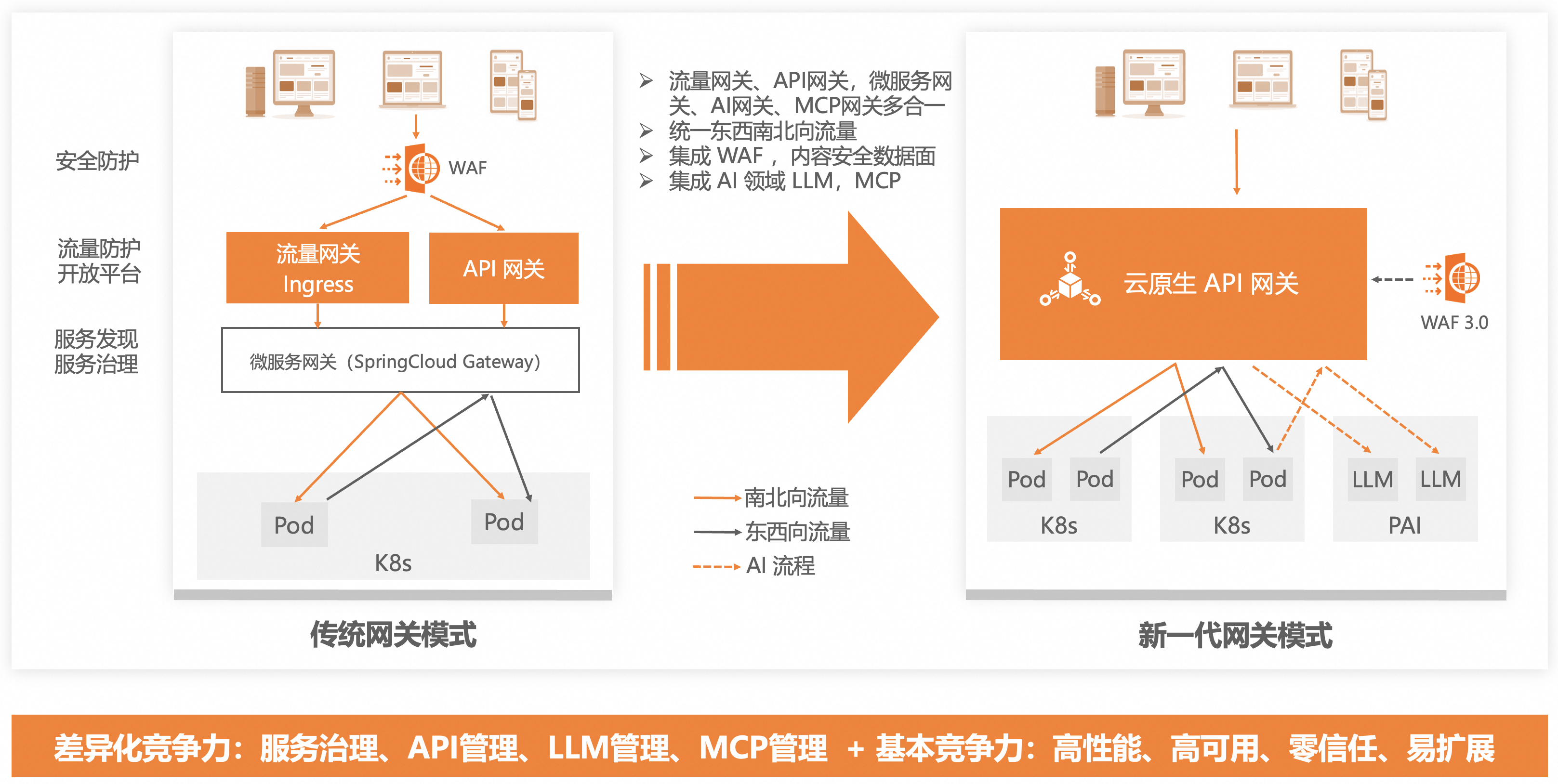 - 作为南北向流量网关,统一管理 AI Agent 的入口流量,核心做转发、负载、鉴权认证、安全、流控等。