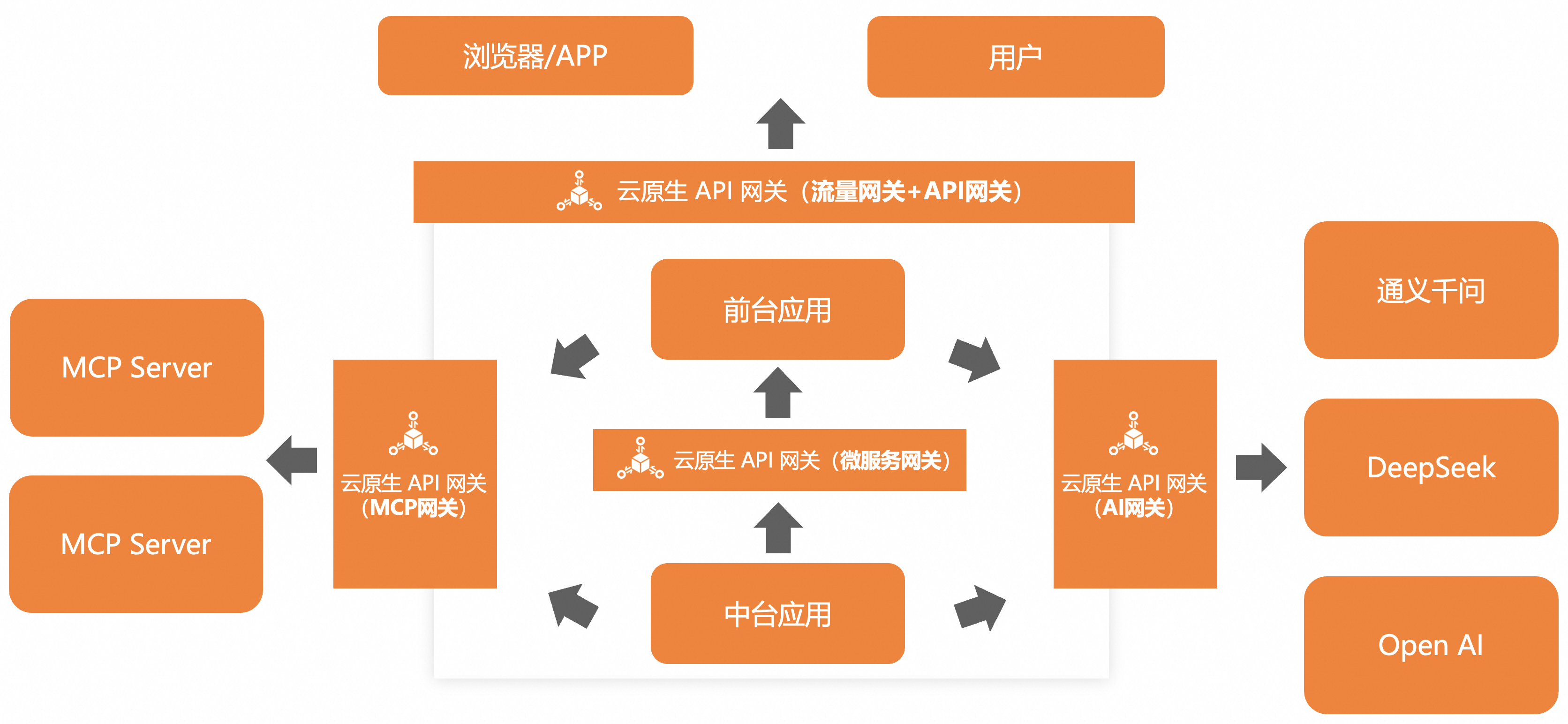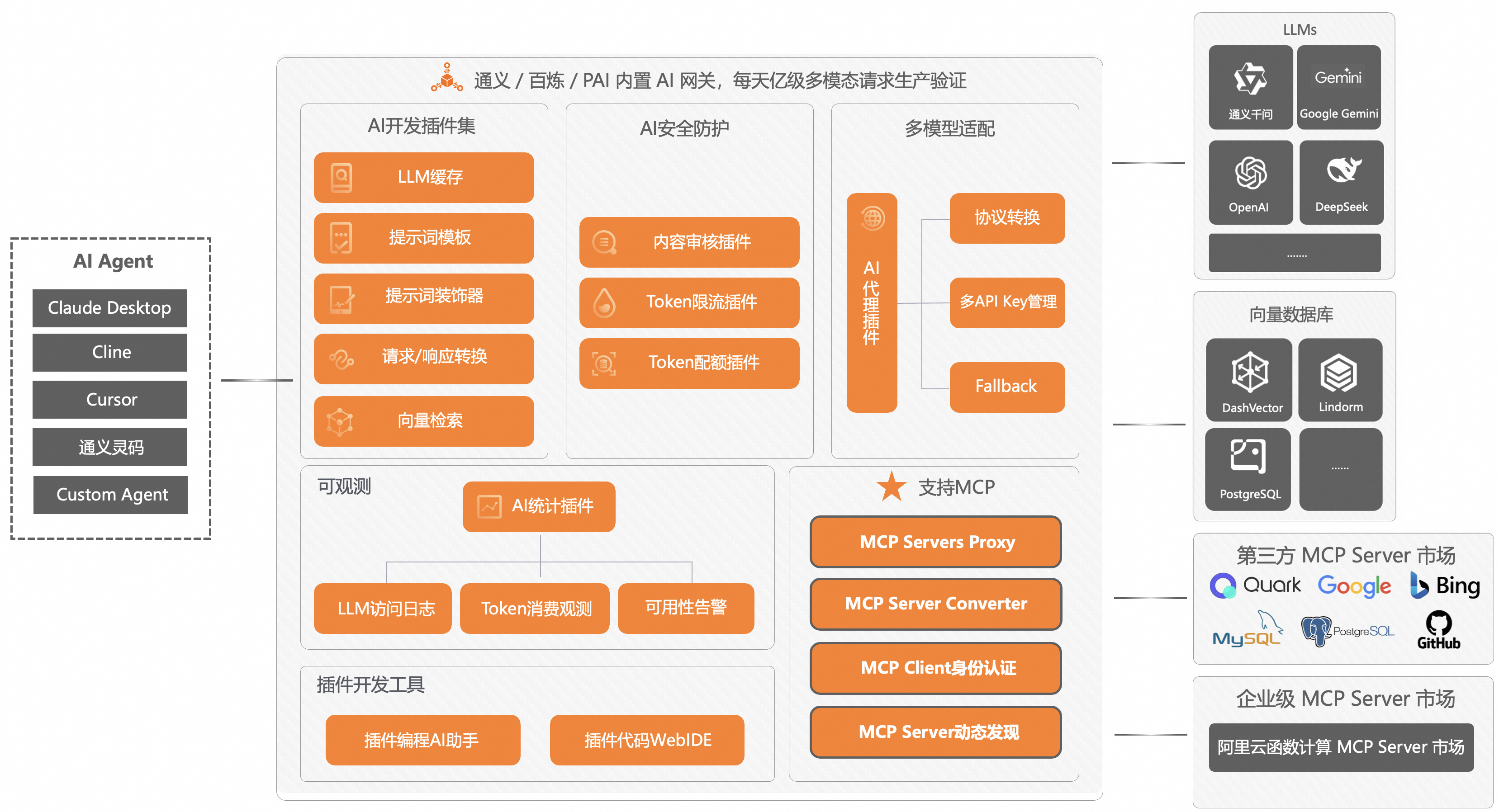 为了能使AI Agent进入到第二阶段(Platform-Level Agents),我们使用云原生API网关做了统一的接入层,通过一个网关三种不同角色的方式,解决了一部分复杂度: