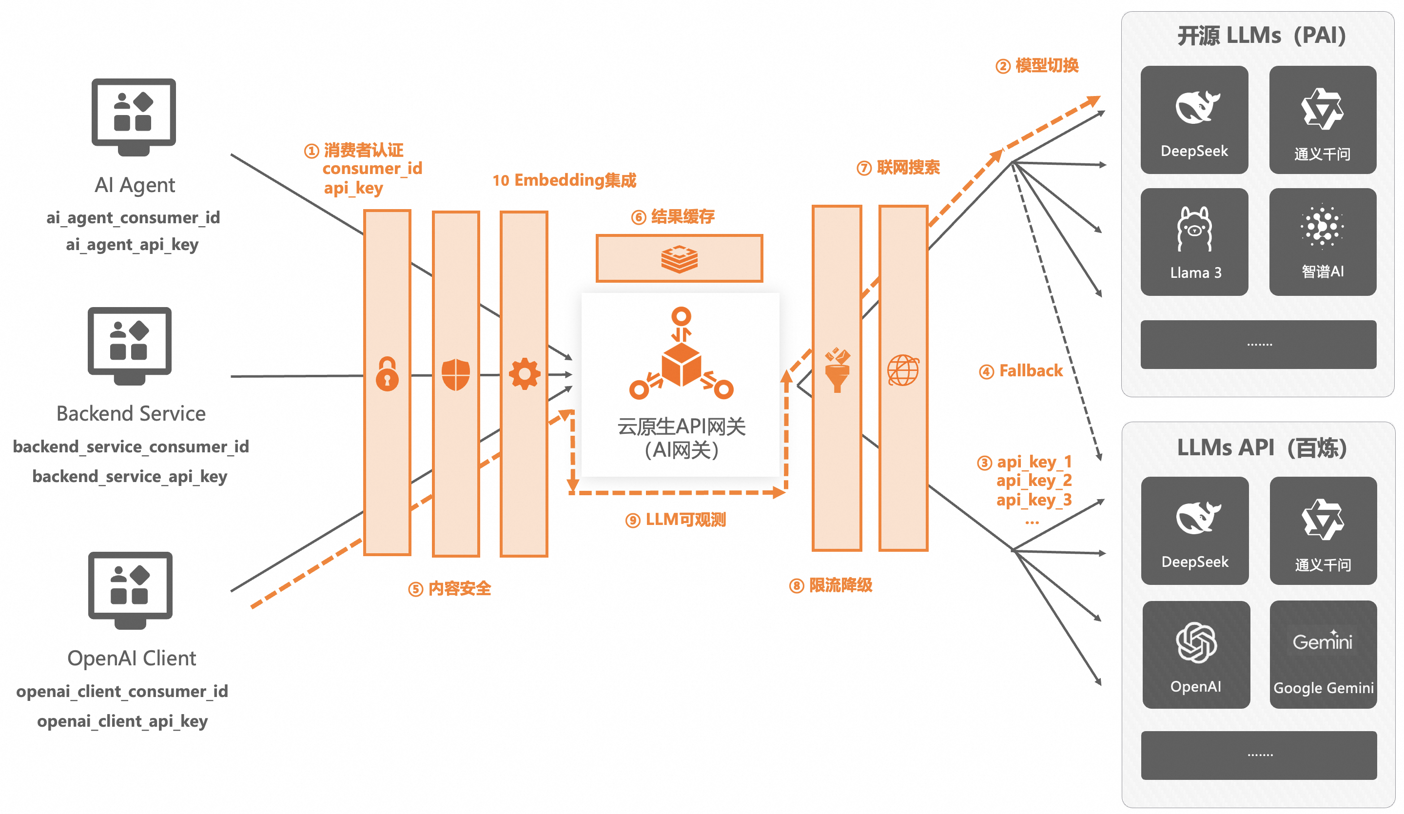 - 第一步:用户向AI应用发起请求,请求流量进入流量网关(云原生API网关)。