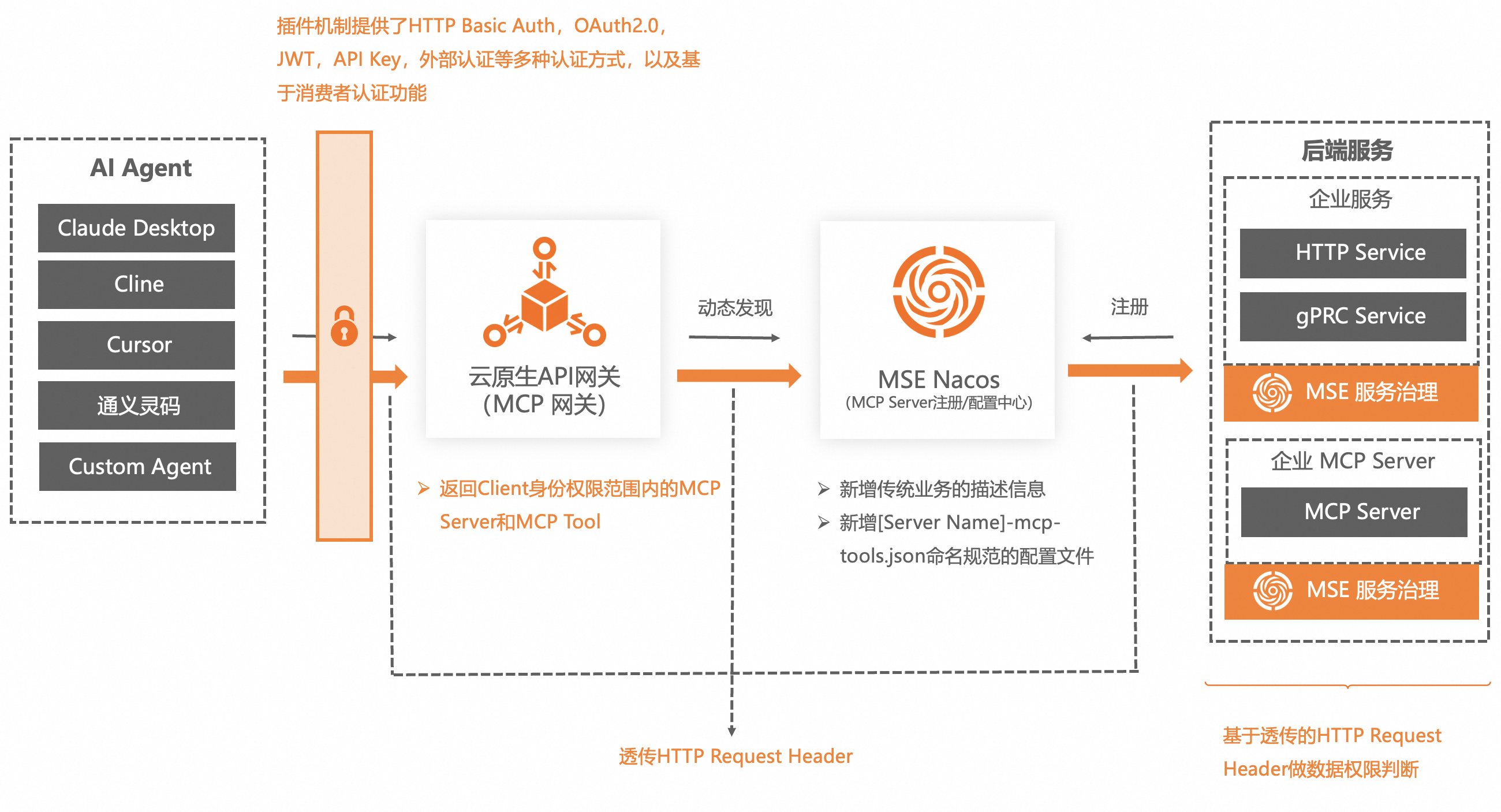 - 作为东西向网关,统一管理来自不同源(ACK、ECS、函数计算 FC、SAE、三方服务)的各类服务,供AI Agent使用。