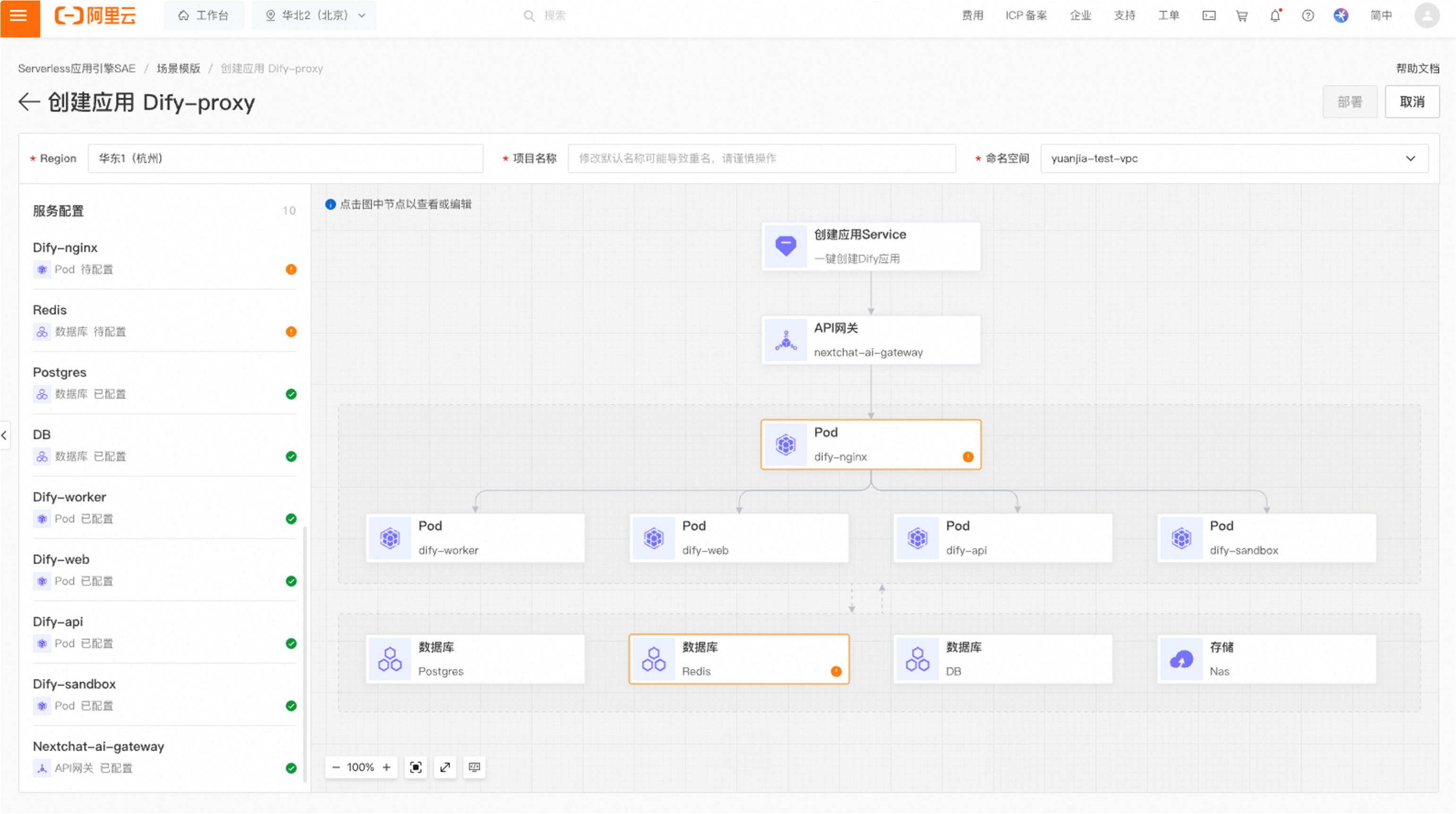 SAE提供了Dify应用模板,可以一键拉起Dify应用,并且提供可视化构建的能力,可以对Dify里的每一个环节进行单独调整。
